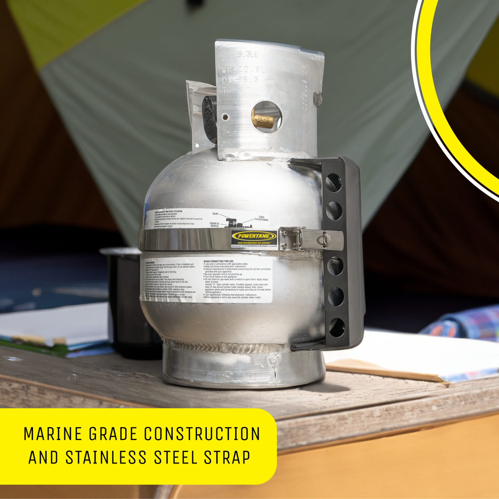 This Propane Tank Bracket for 10 lb Aluminum Propane Tanks is the ideal way to carry large amounts of propane on your boat, trailer, RV, or overland vehicle. Featuring a marine-grade, powdercoated frame and stainless steel latches and hardware, this bracket is built to withstand the test of time. Rubber trim on all contact points with the propane tank ensures a noise free mount and will keep your propane tank looking fresh. This bracket is designed to hold a 10 lb. Aluminum Worthington (196126) or a Trident (14100010) 2.4 gallon propane tank. Aluminum propane tanks are lighter than steel tanks and are corrosion resistant.
