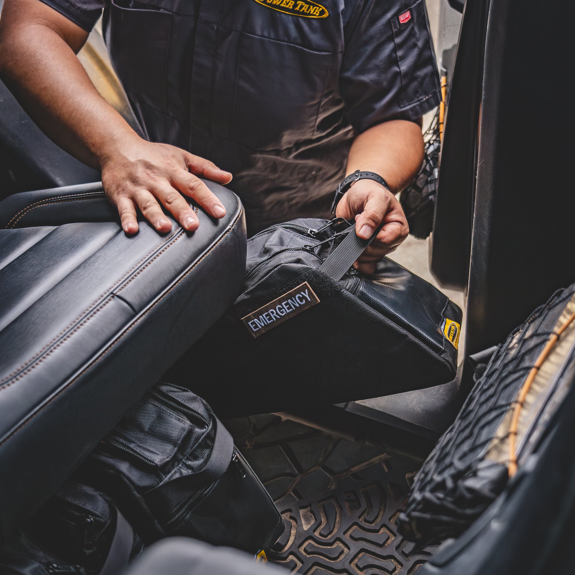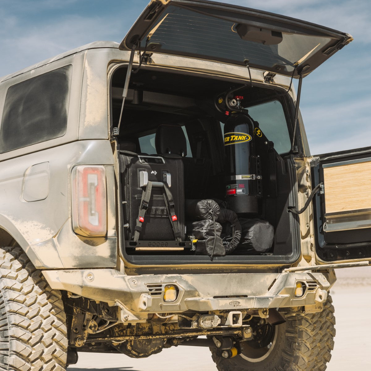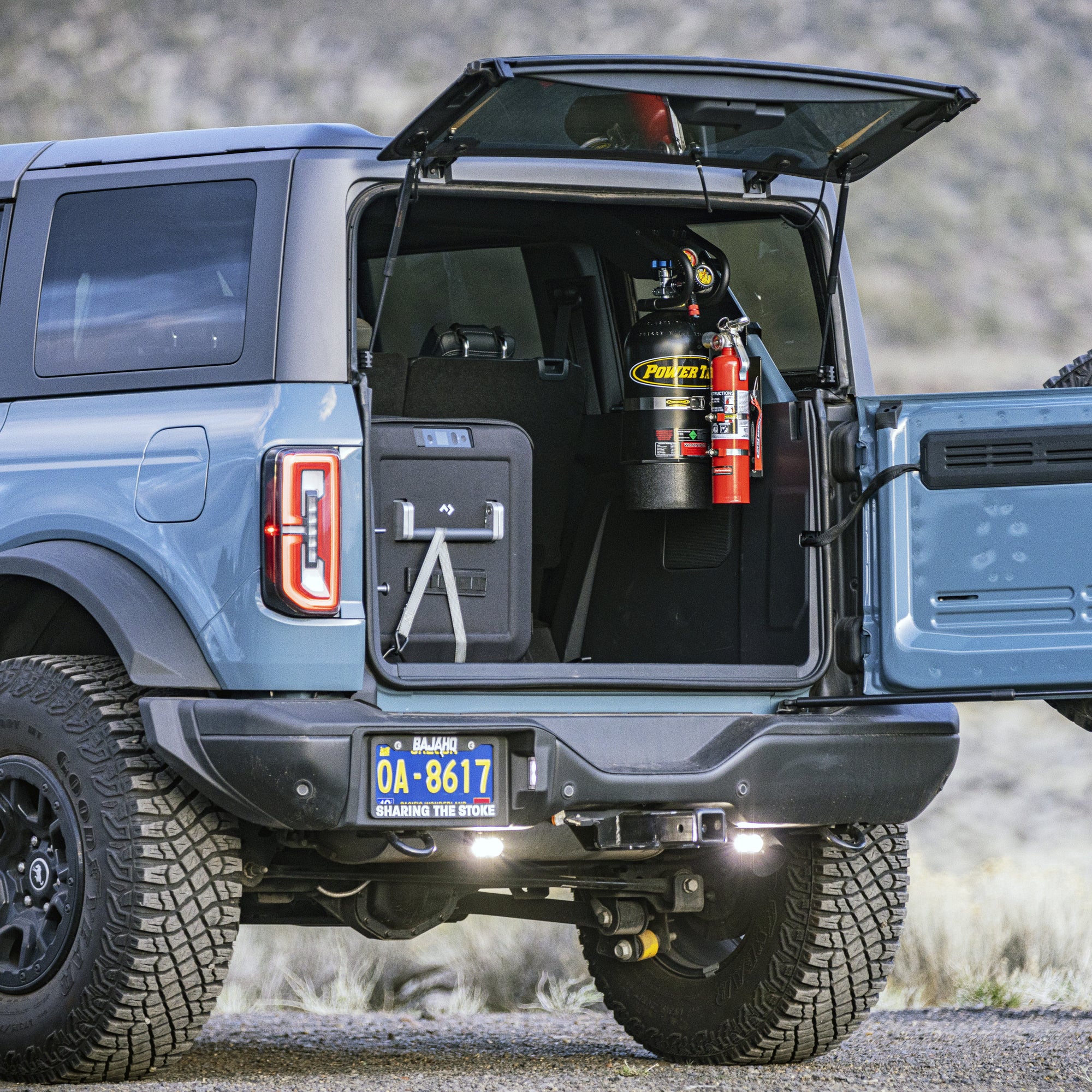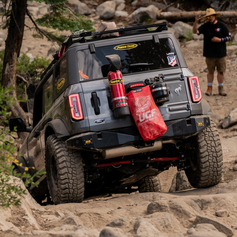 The 2 Door Bronco gets a Behind-the-Seat mount with a built-in MOLLE panel. Add a bag or mount a fire extinguisher bracket! We re-use factory mounting locations for a simple, bolt-in install.