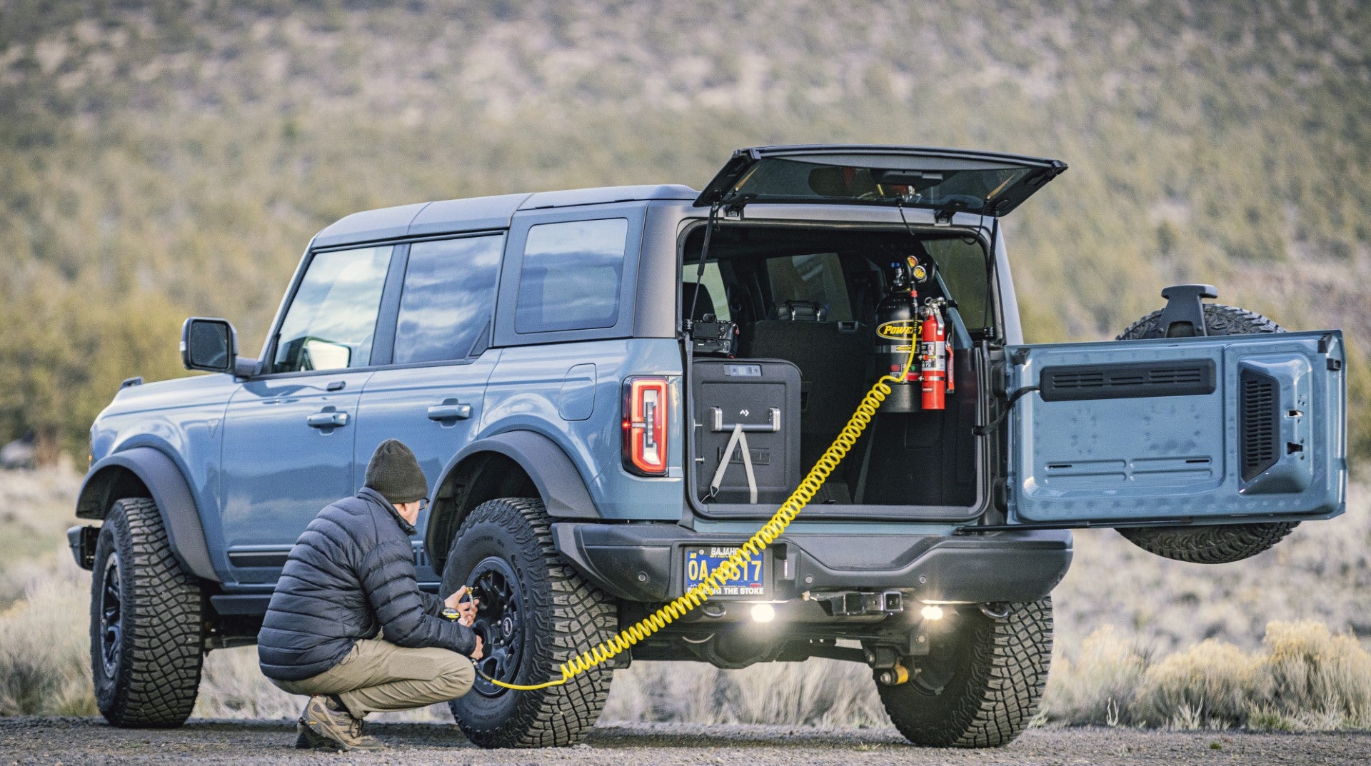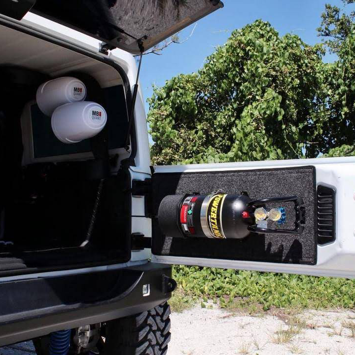 Power Tanks are mounted easily to nearly any flat surface, like this tire carrier swing out. Easy to access and air up gear like hoses could be mounted to the side of the Power Tank or behind it.
