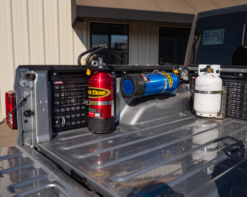 Bed Side MOLLE Panels are useful for any truck. Mount your Power Tank, bags, and other gear! This is a BuiltRight system with a Power Plate.