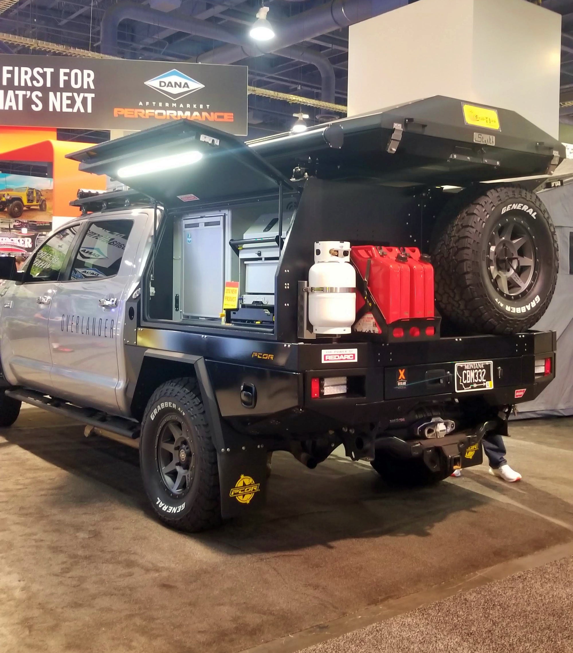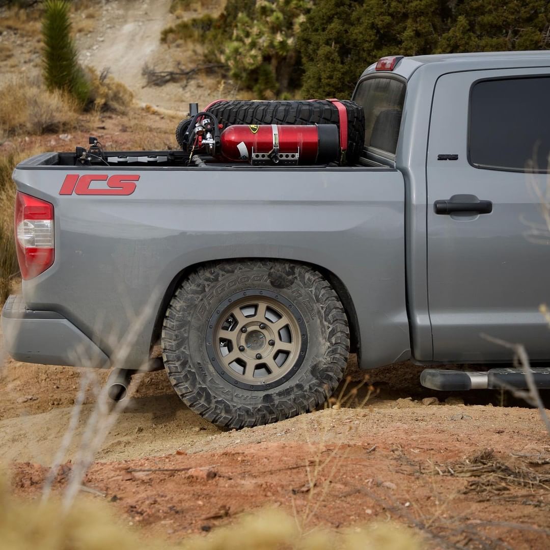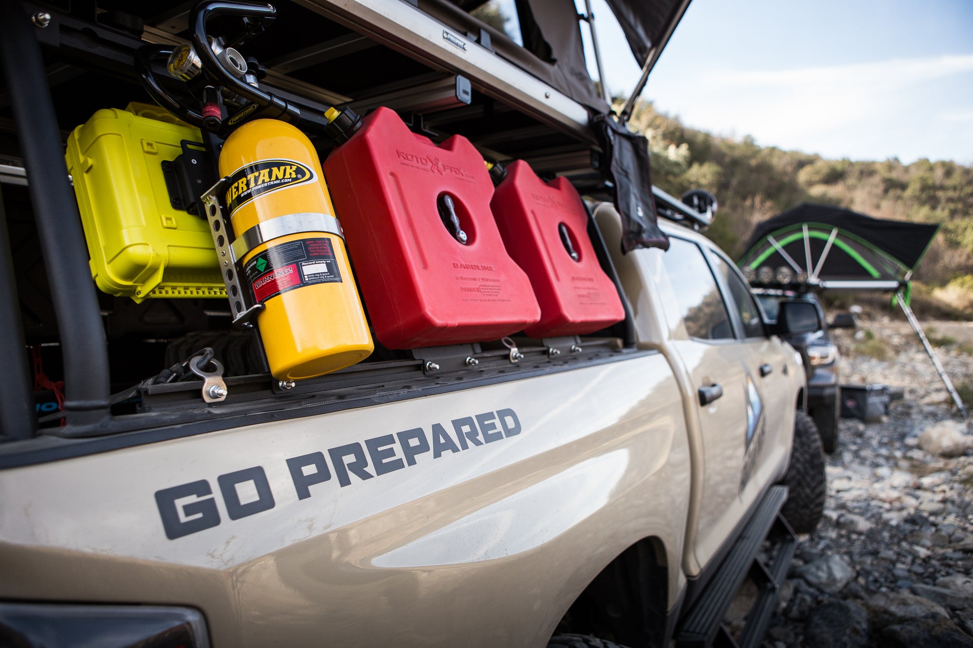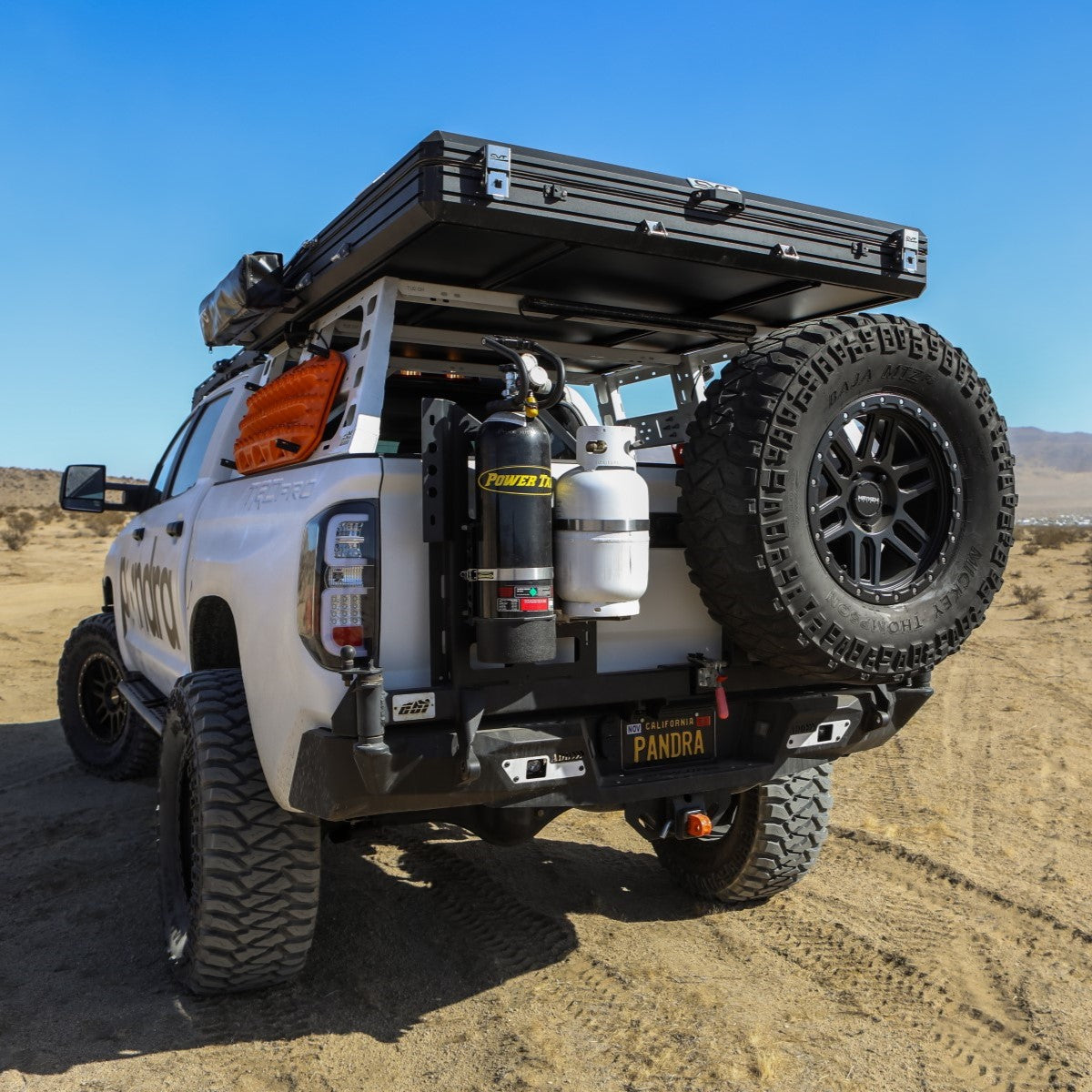 Even the most serious Overland vehicles use Power Tank brackets. This 11 lb propane tank and Strato Bracket is bolted to a Patriot Camper Tray Bed on this Tundra.