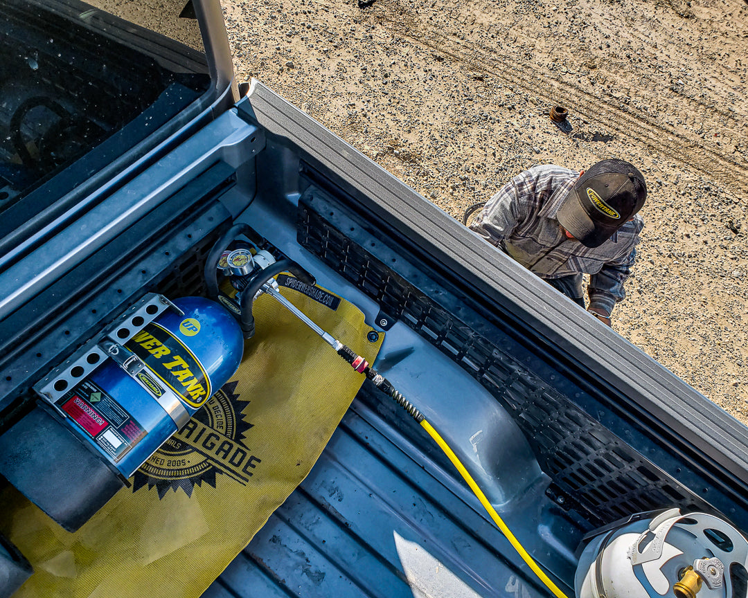 This 15 lb Power Tank is mounted horizontally to the bedside using MOLLE panels. A Snorkel Tube allows horizontal use.