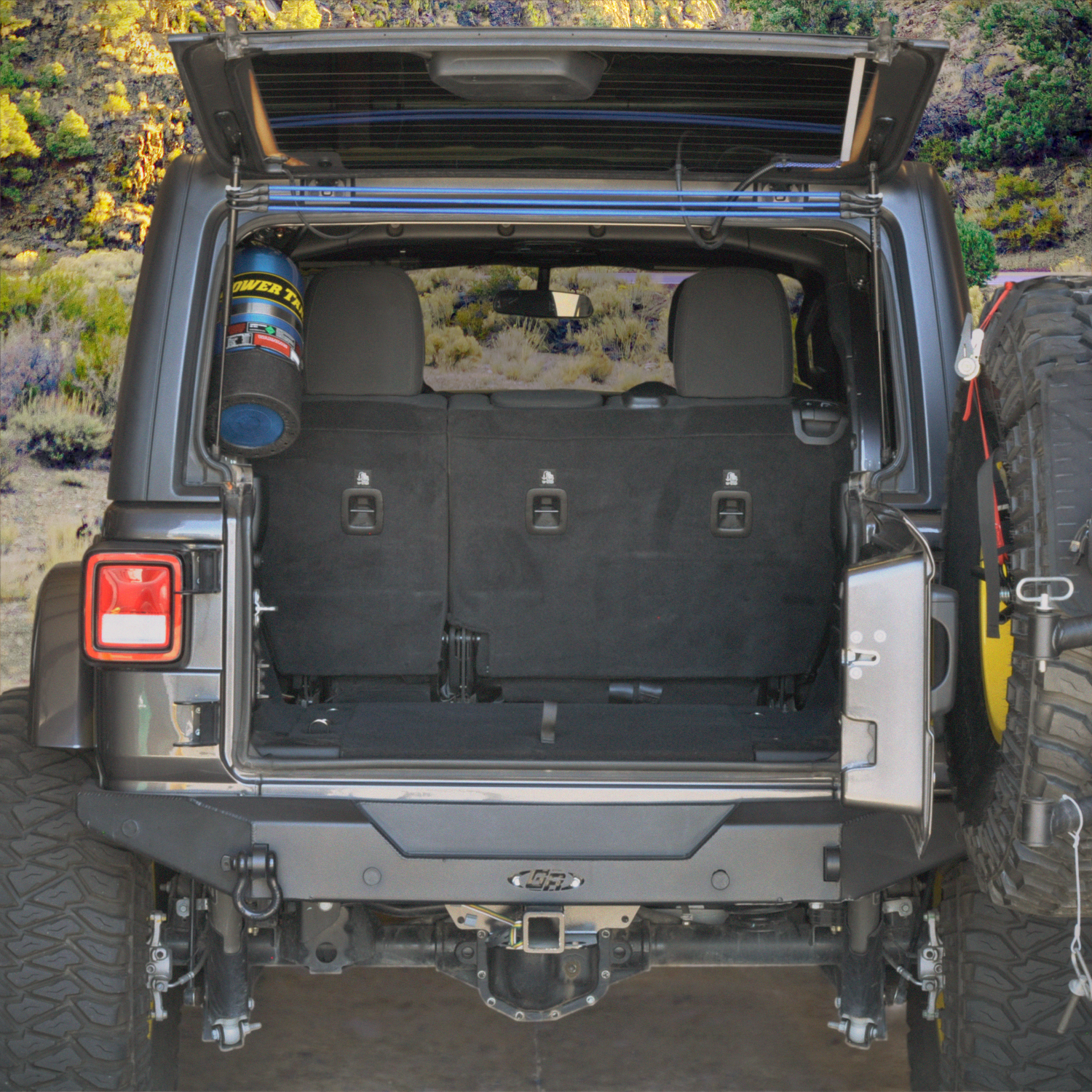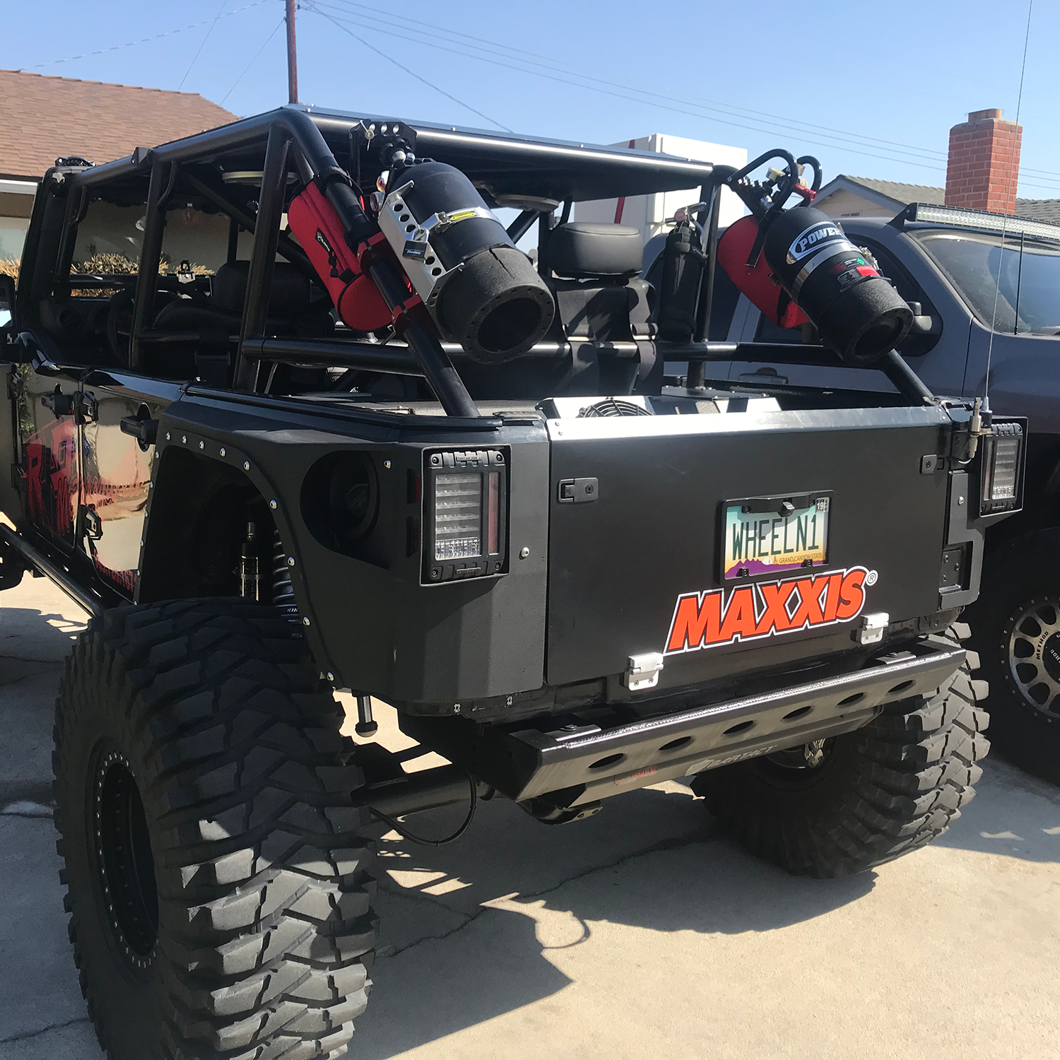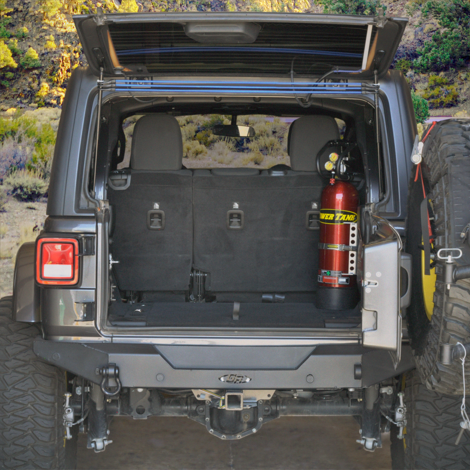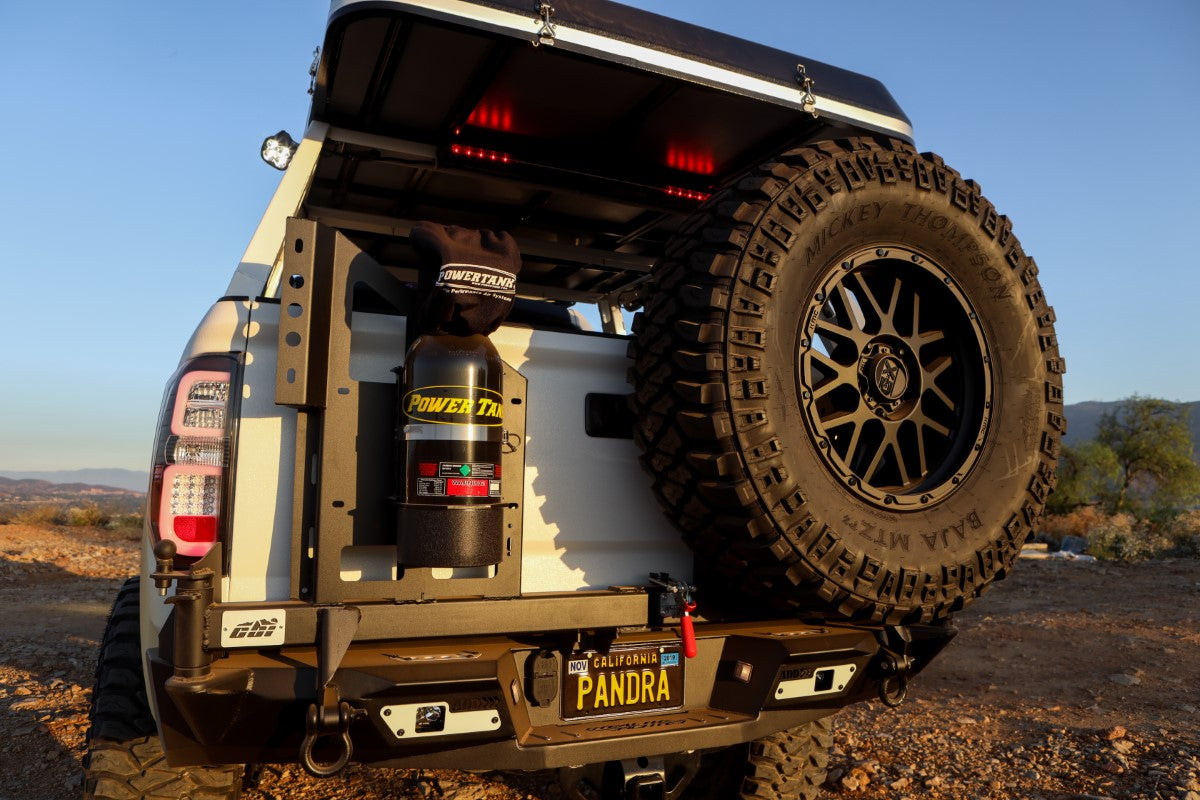 The sky is the limit for Power Tank mounts. The FabFours tire carrier delete is the widest on the market, giving the most mounting area. Both a 15 lb Power Tank and a 5 lb propane tank and Teton bracket fit on the tailgate.