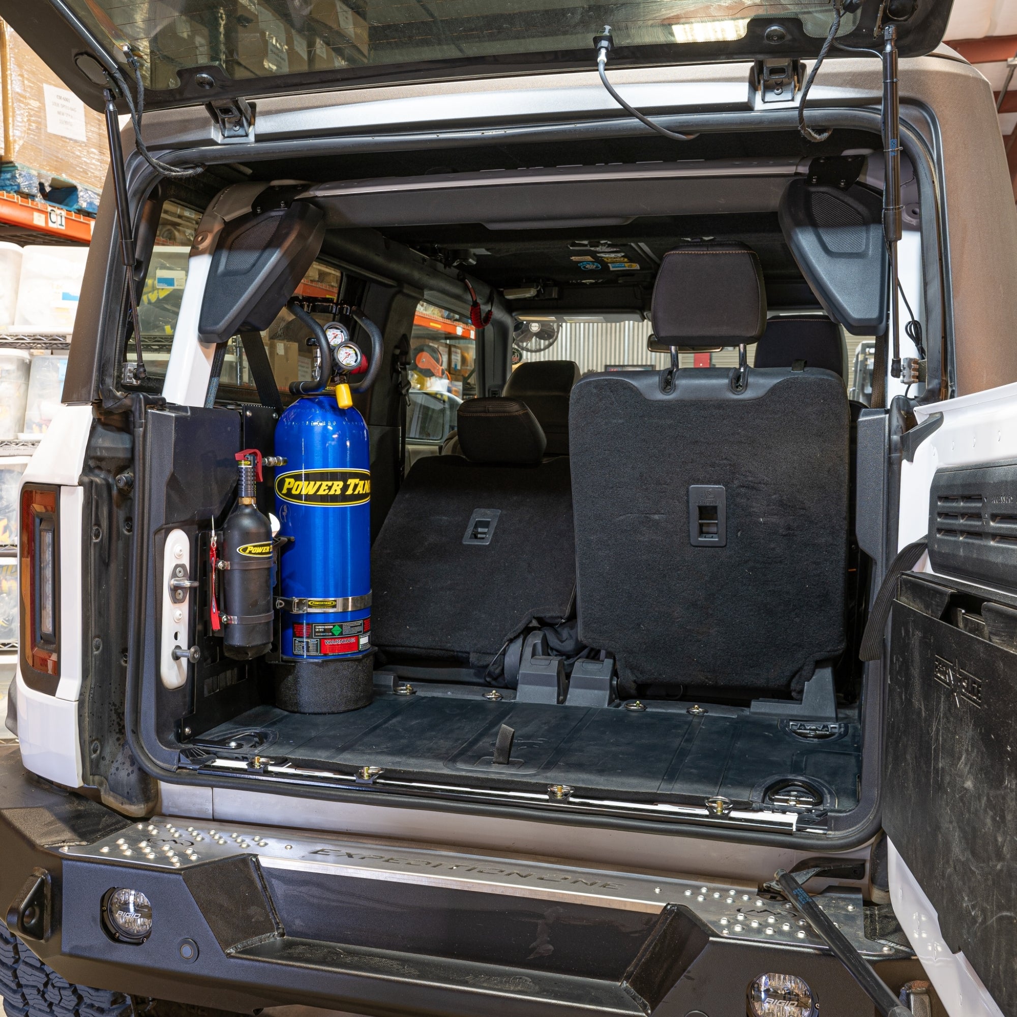 Bespoke Roll Bar Clamps to fit the Bronco roll bar profile and a hardened steel plate make this one of the stiffest Power Tank mounts we offer. There is a driver and passenger side mount.