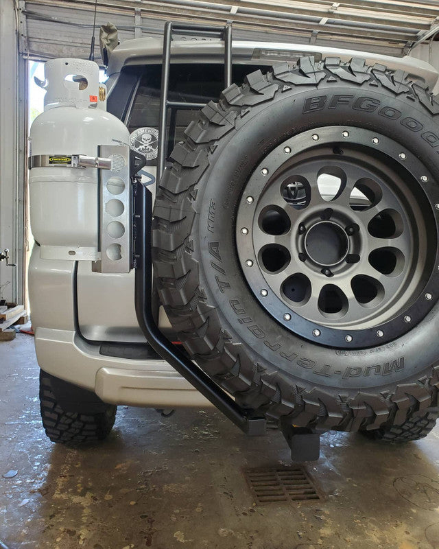 This mount is a bolt-in to the rear of a 5th gen 4Runner. It fits a 10 lb Power Tank or a 5 lb or 11 lb propane tank.