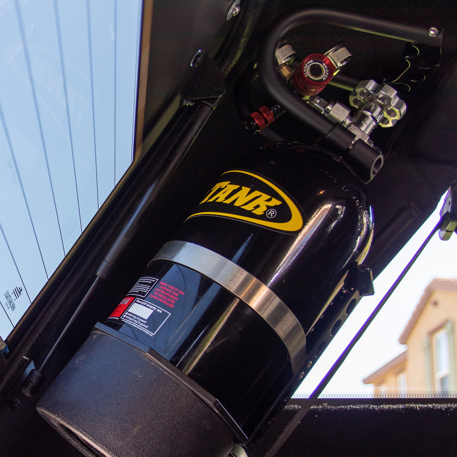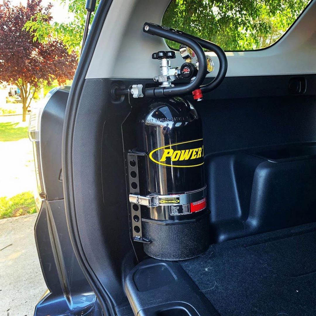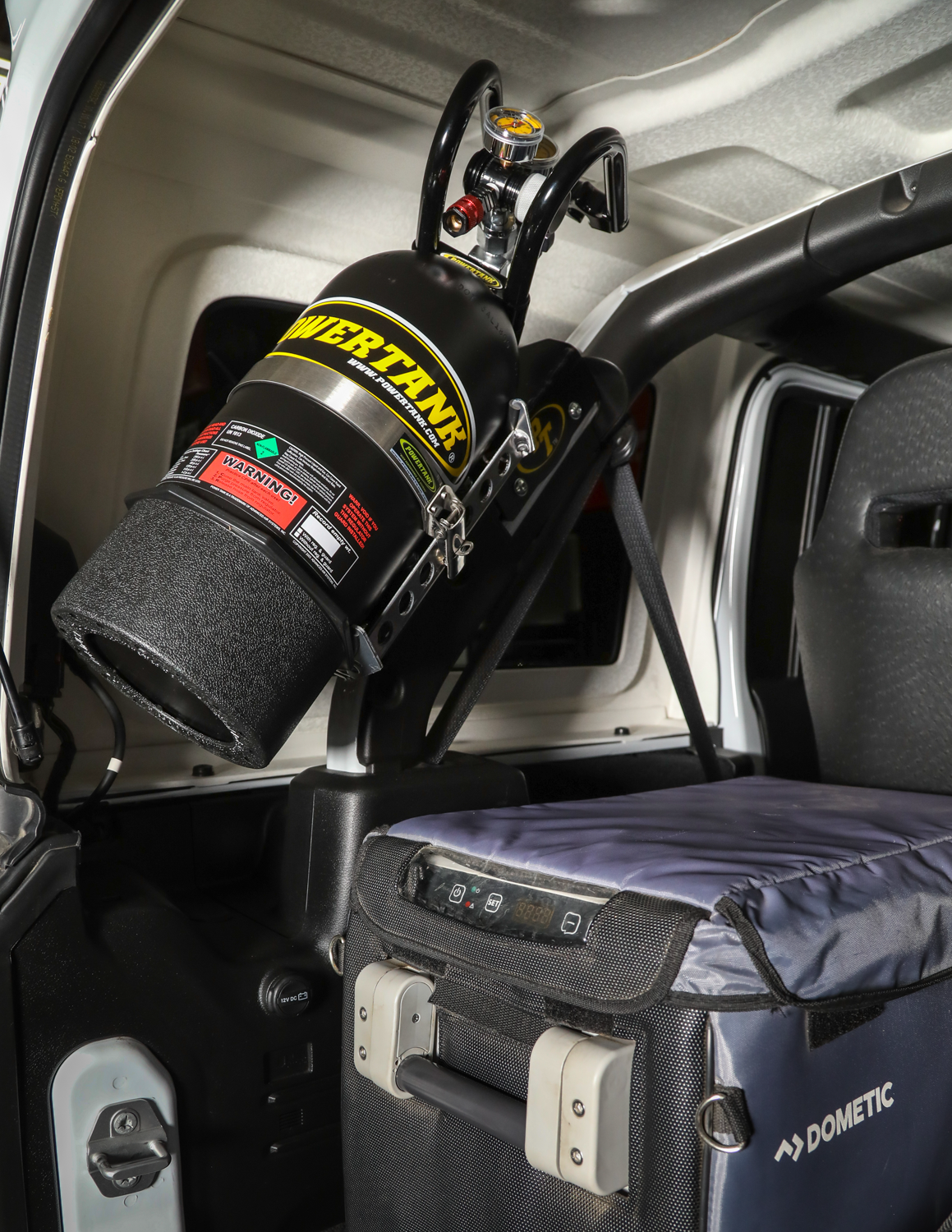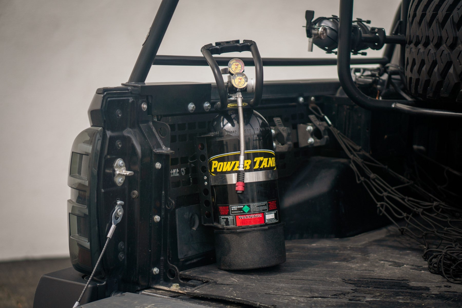 A 10 lb Power Tank sits snugly in the rear corner using the Sports Bar Mount, taking up, otherwise, unused space.