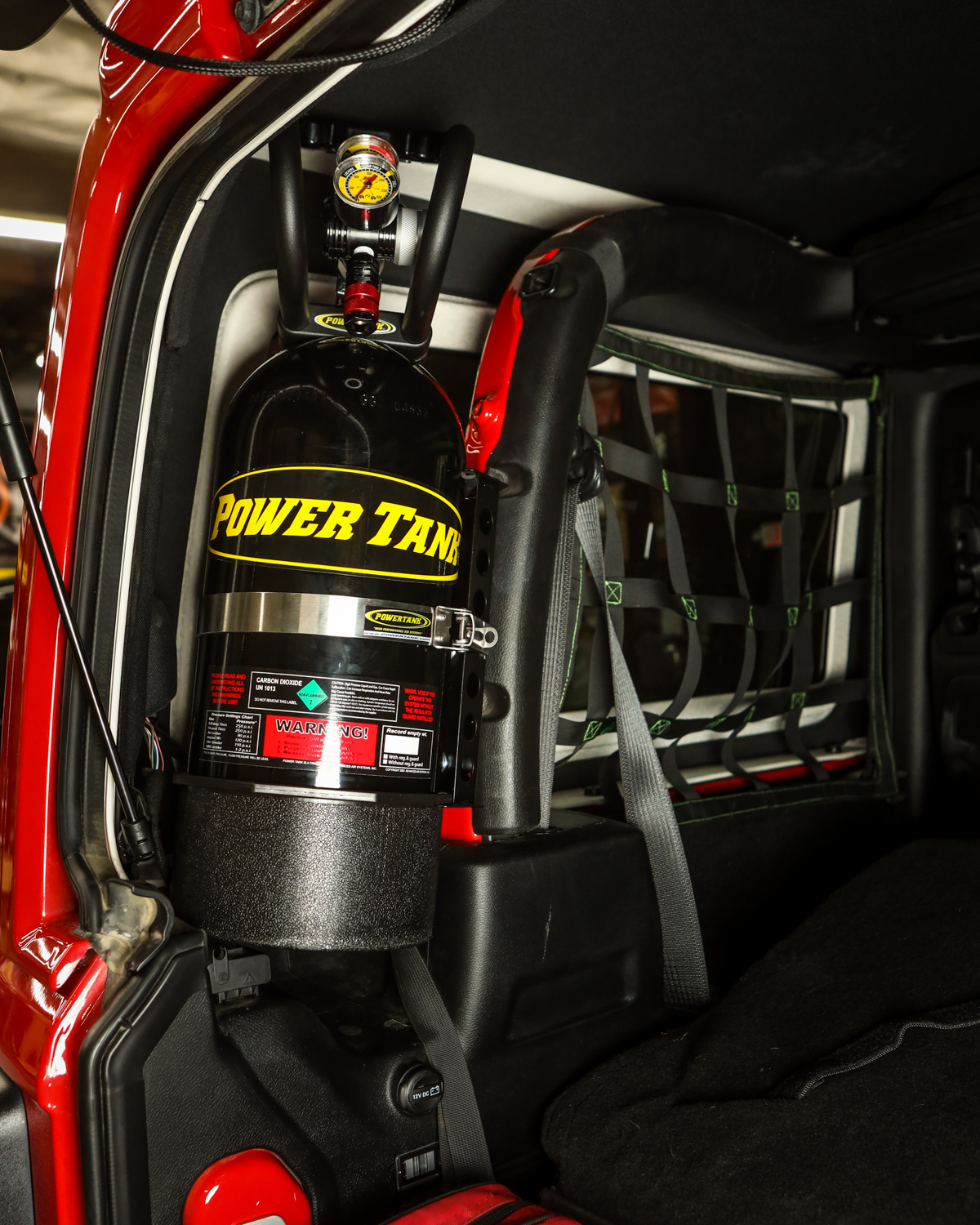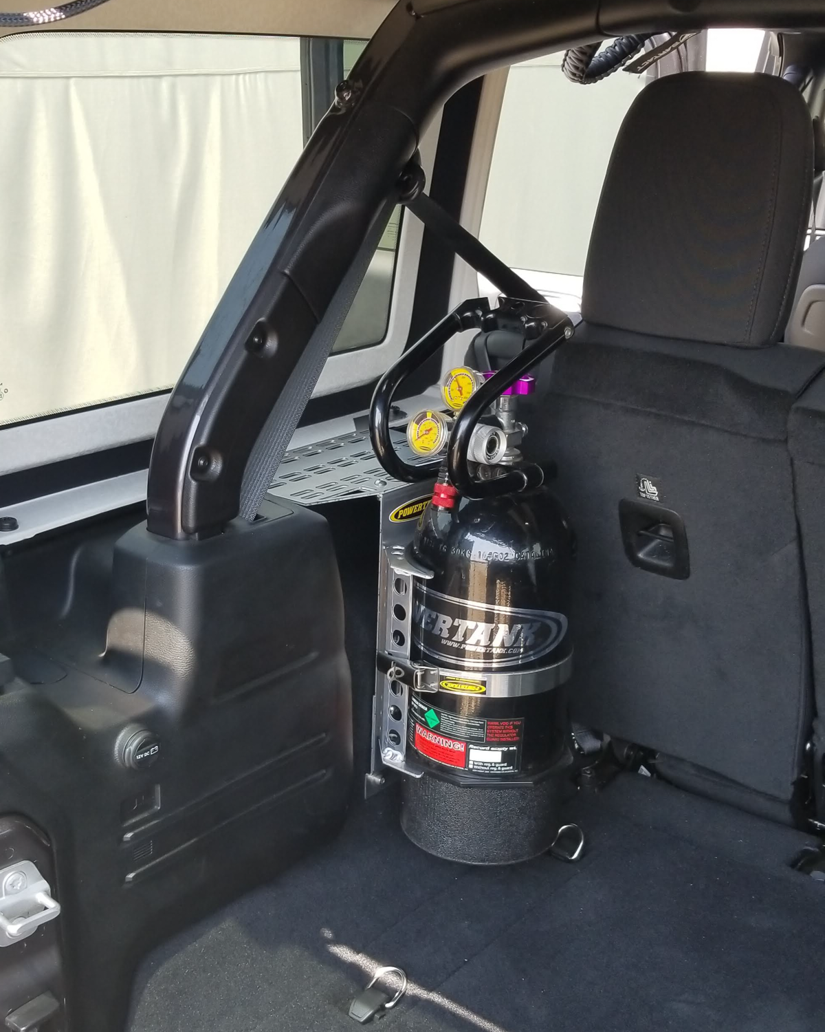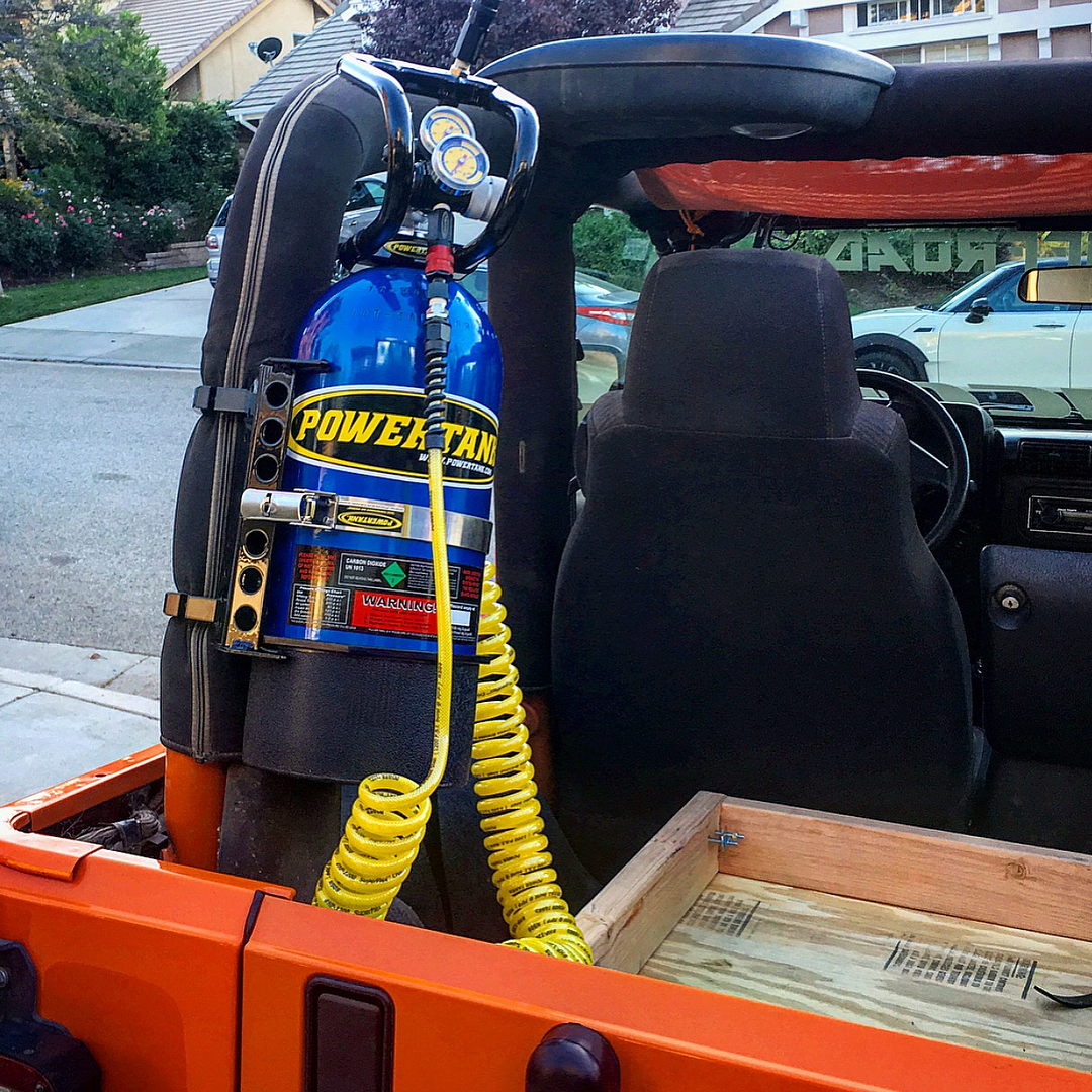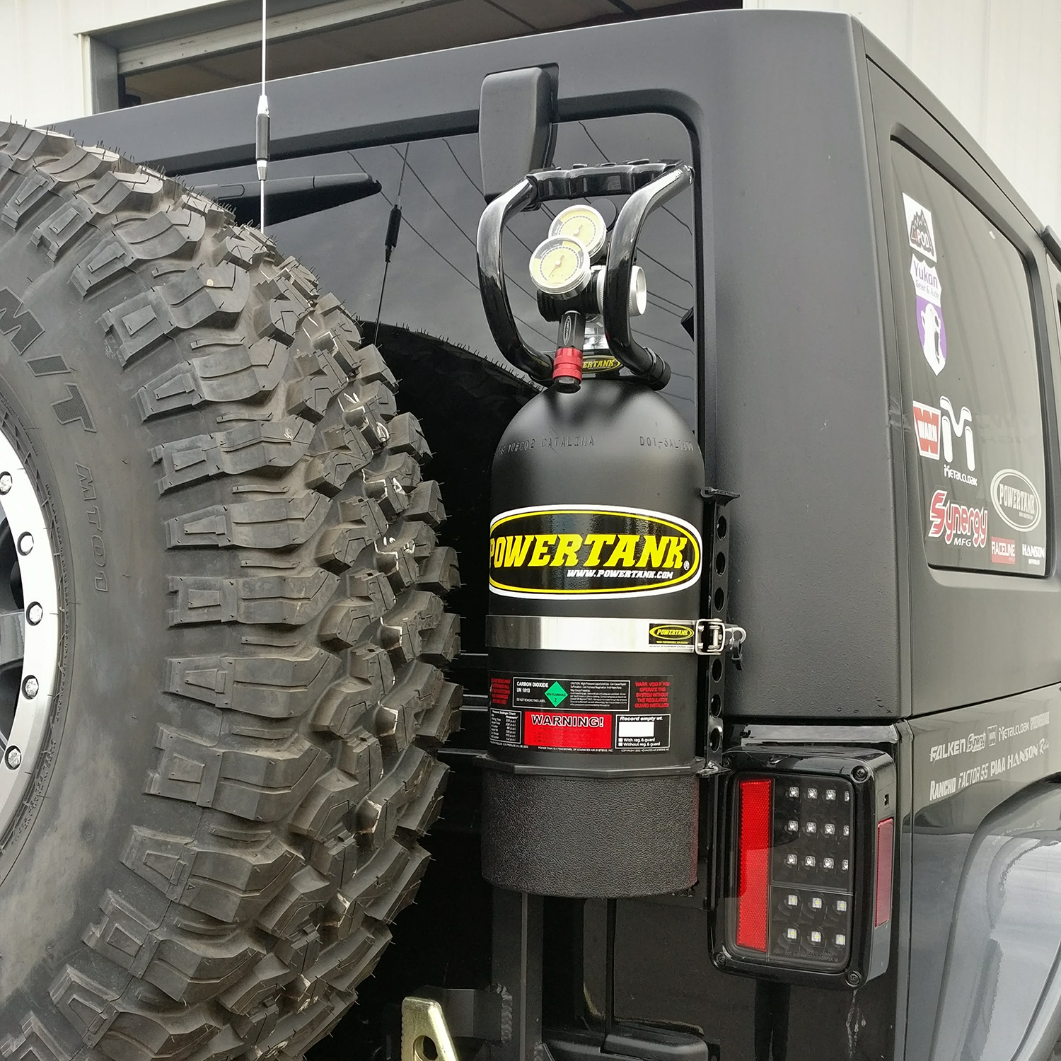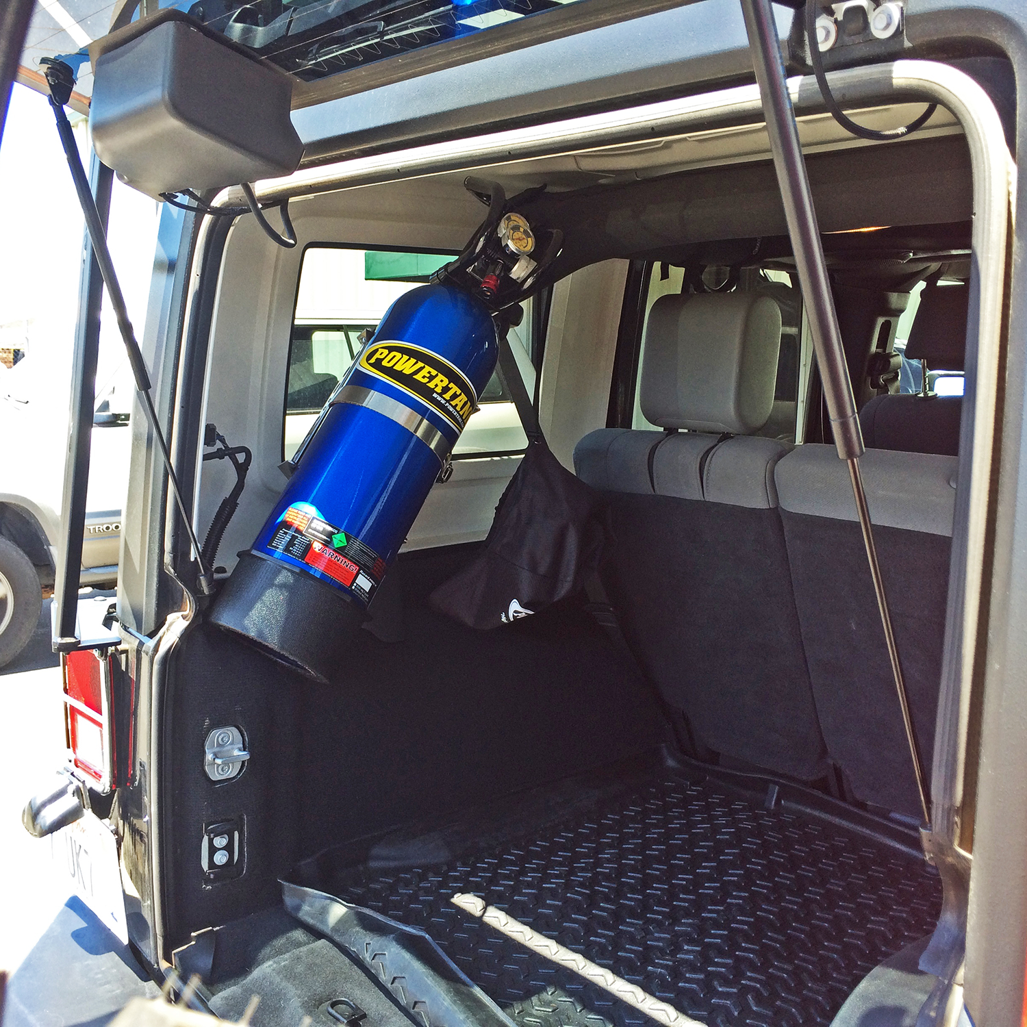 The 10 lb Power Tank fits perfectly in the back of a two door JK mounted to the factory Sports Bar using Large Roll Bar Clamps.