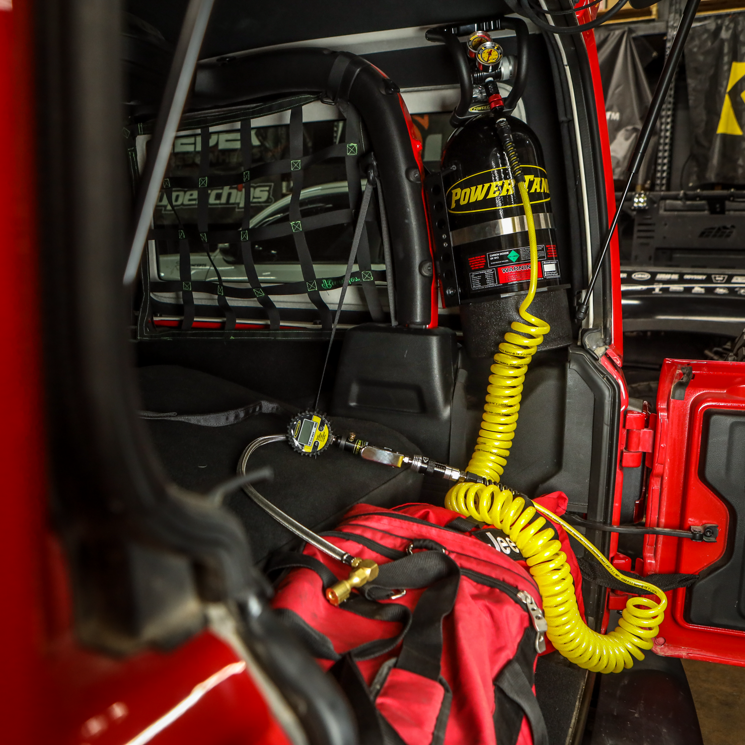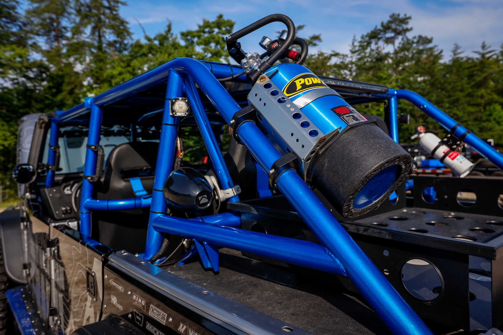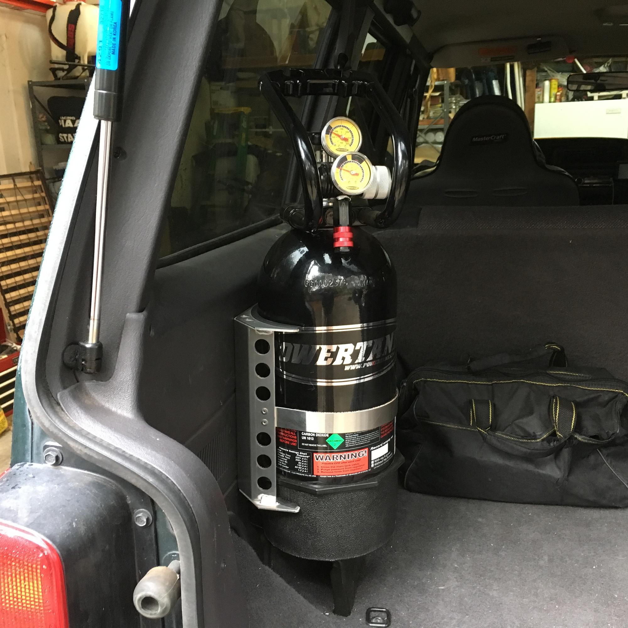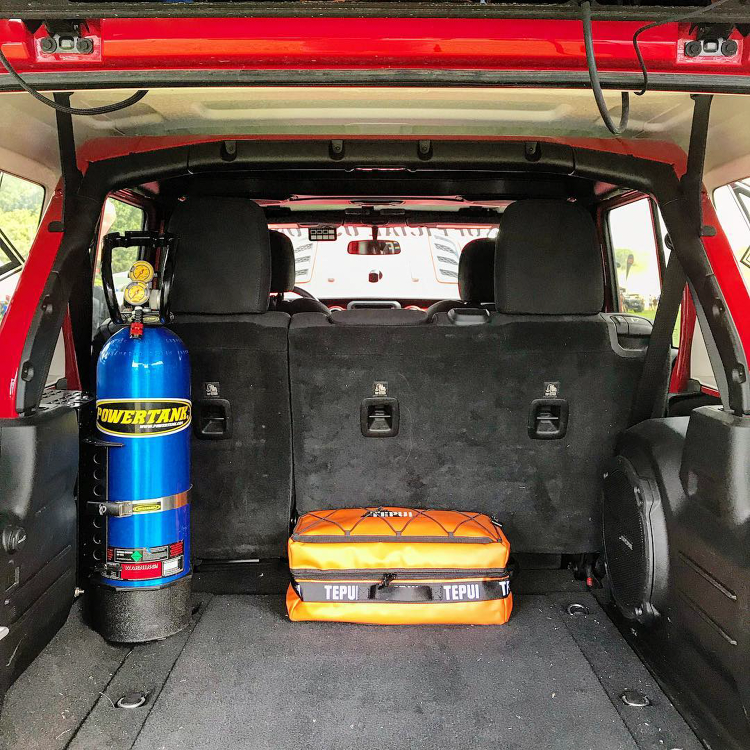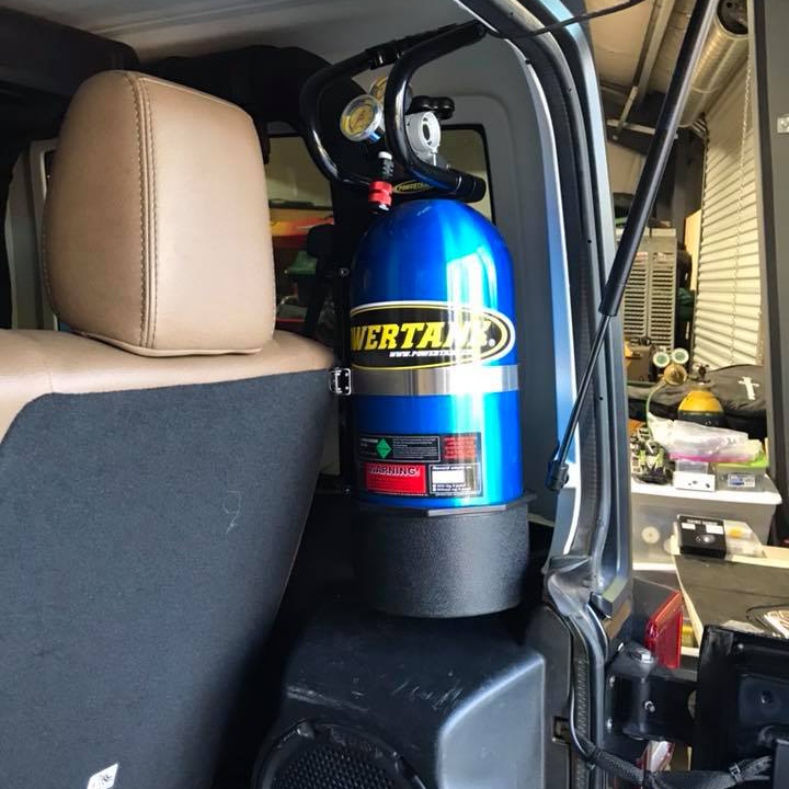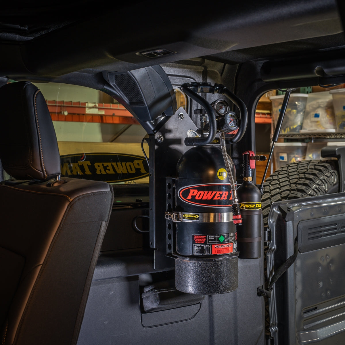 The 10 lb Power Tank fits perfectly in the back of a two door JK mounted to the factory Sports Bar using Large Roll Bar Clamps.