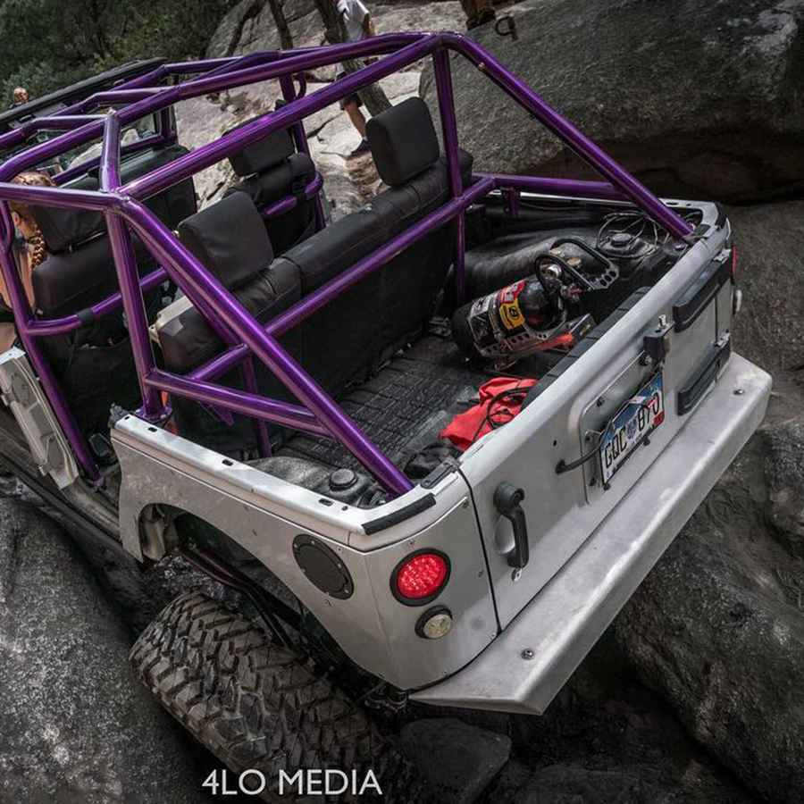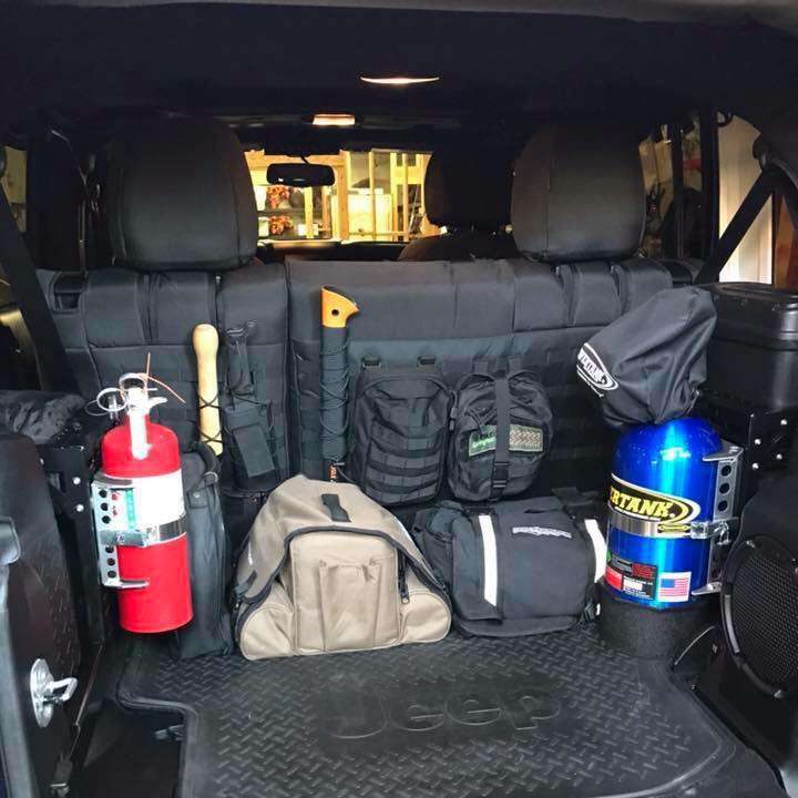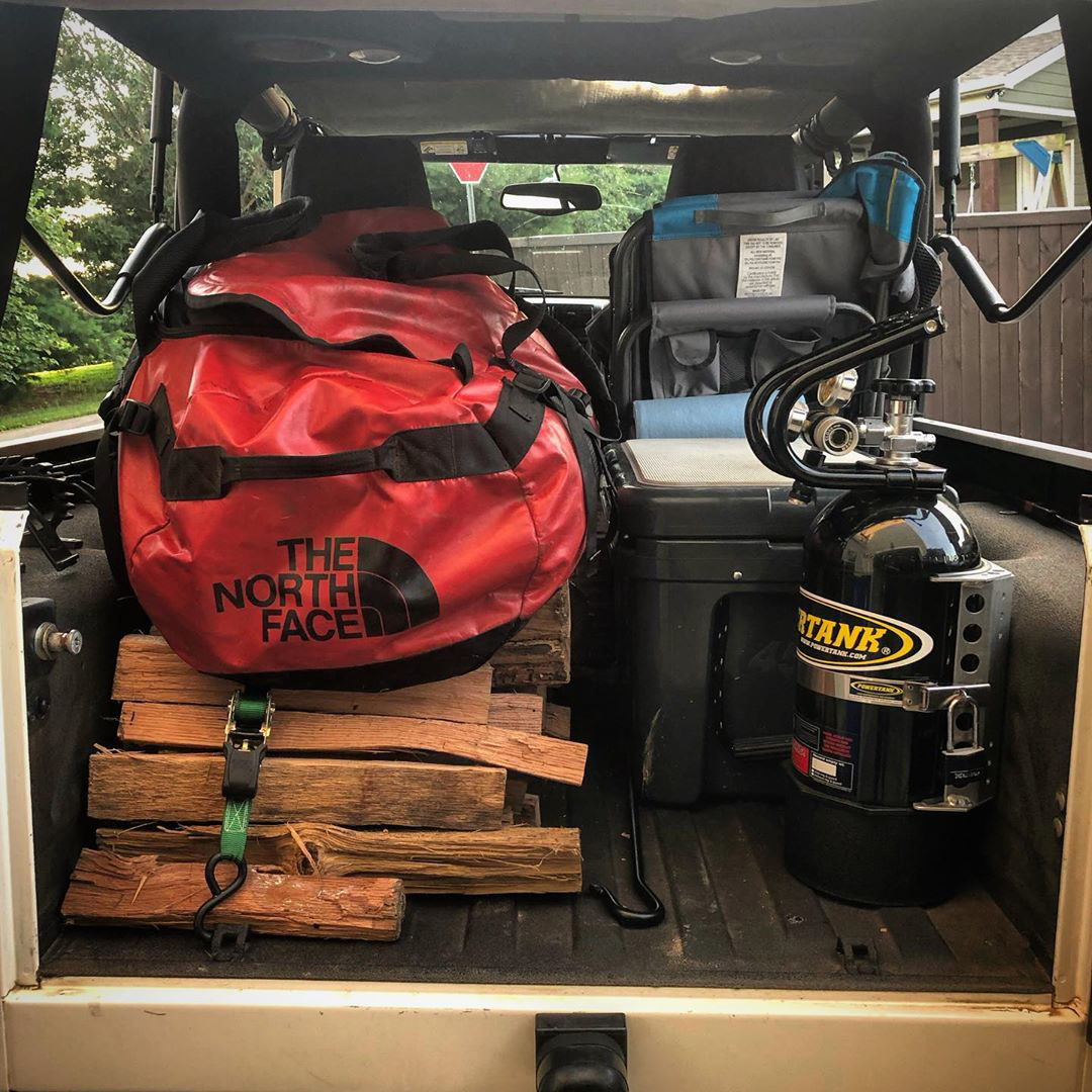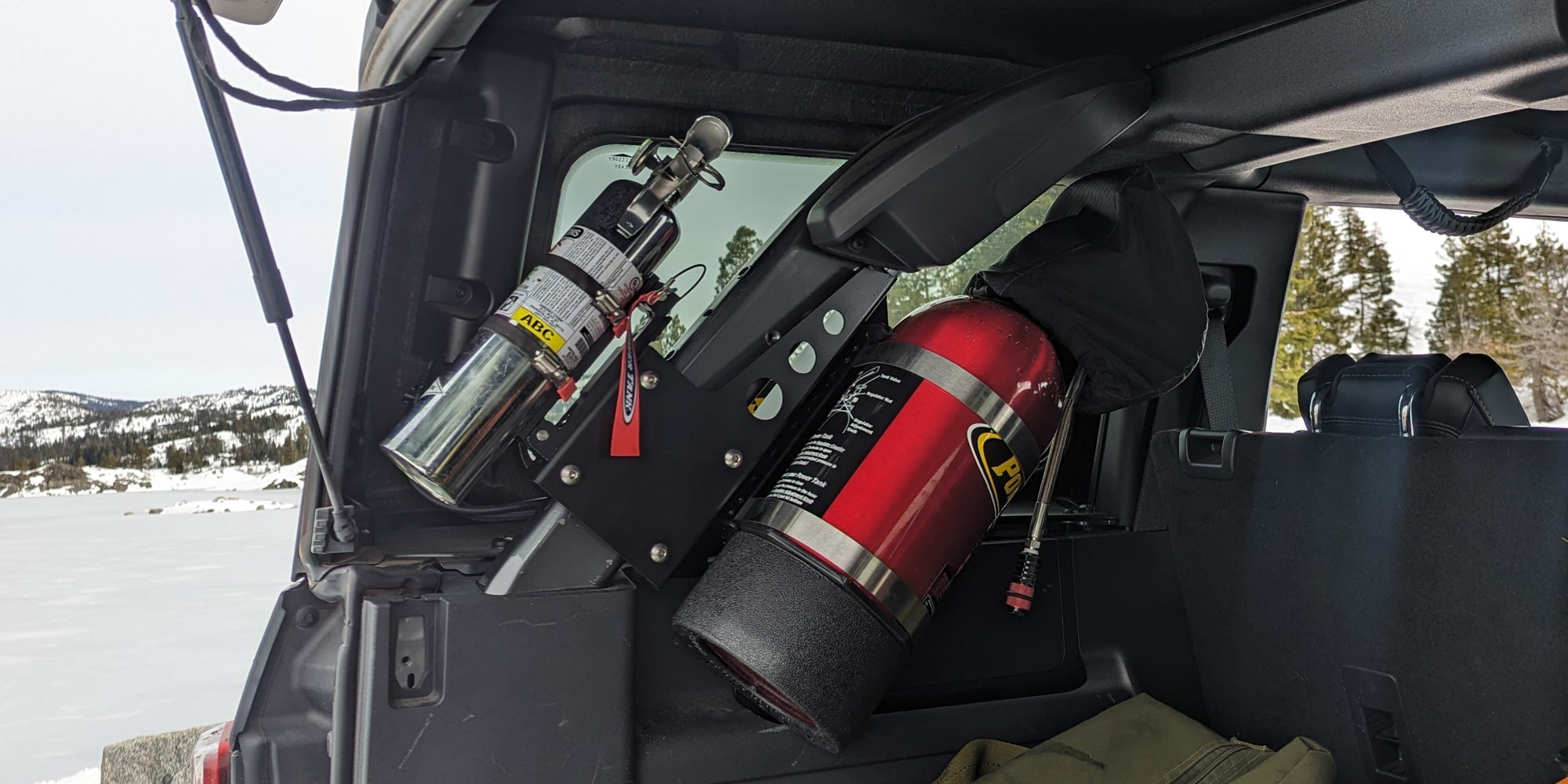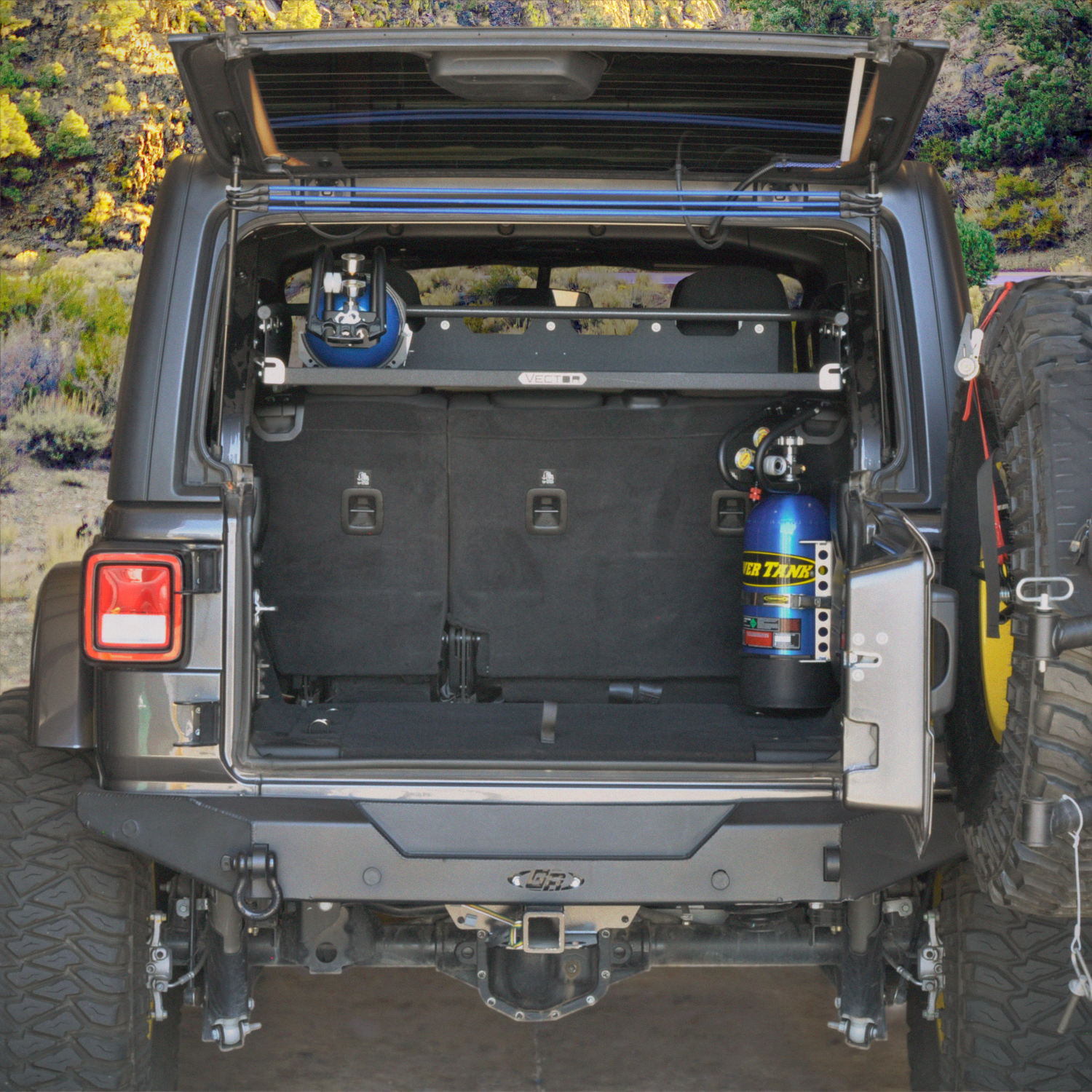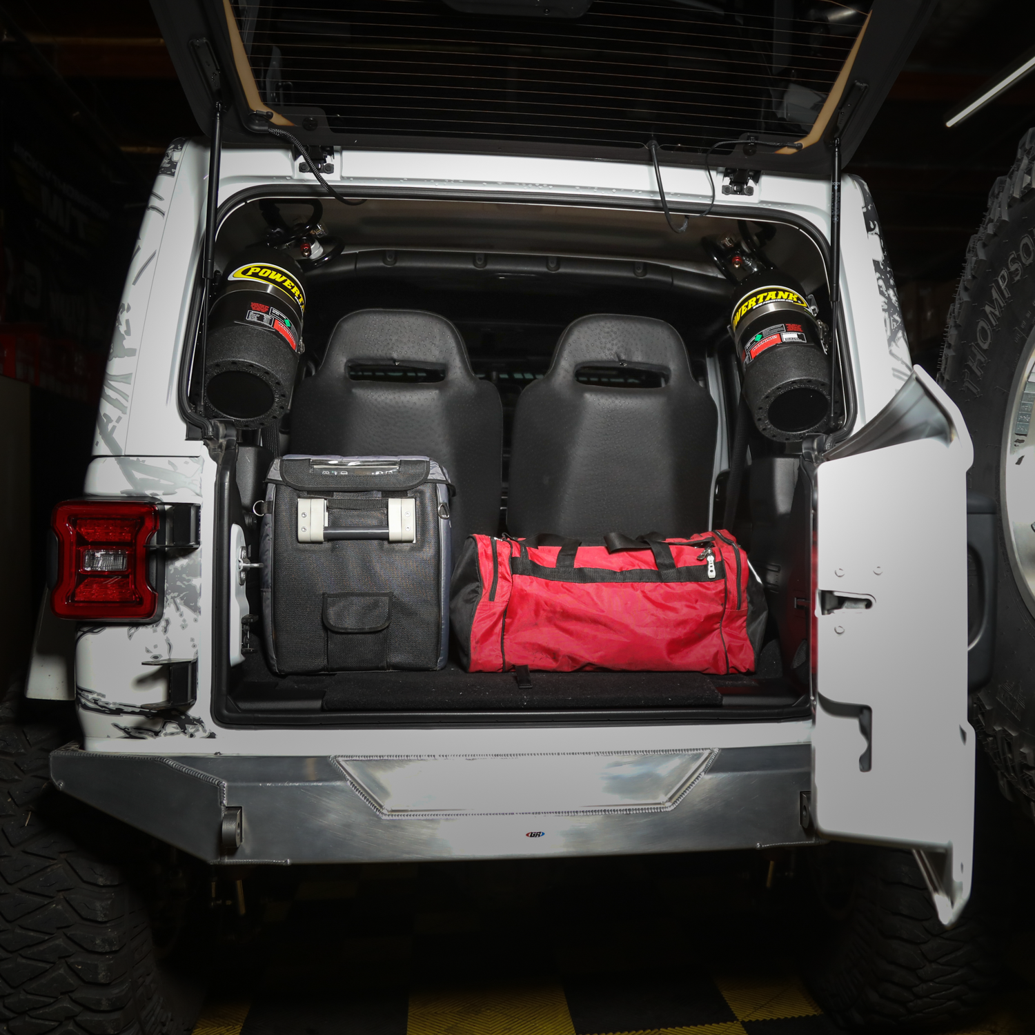 The 10 lb Power Tank fits perfectly in the back of a two door JK mounted to the factory Sports Bar using Large Roll Bar Clamps.