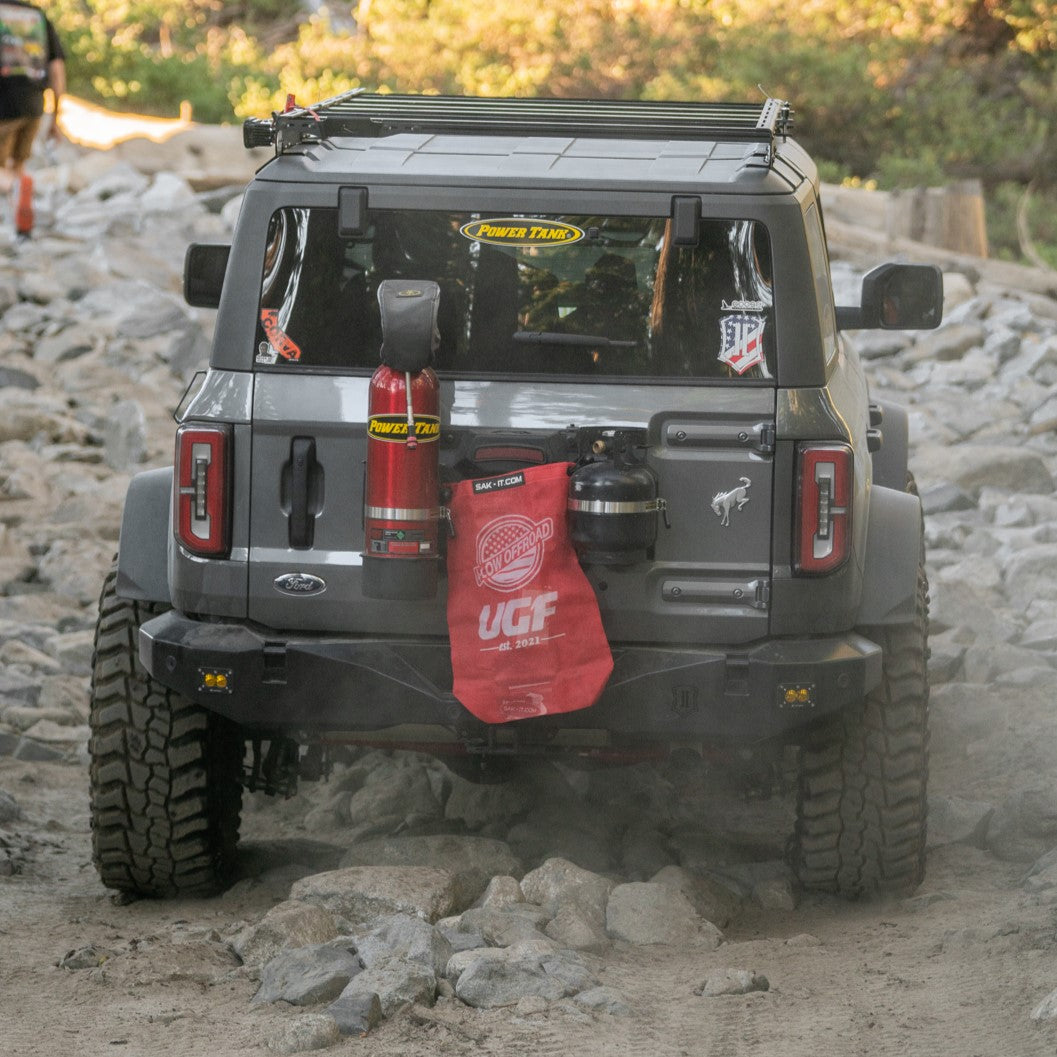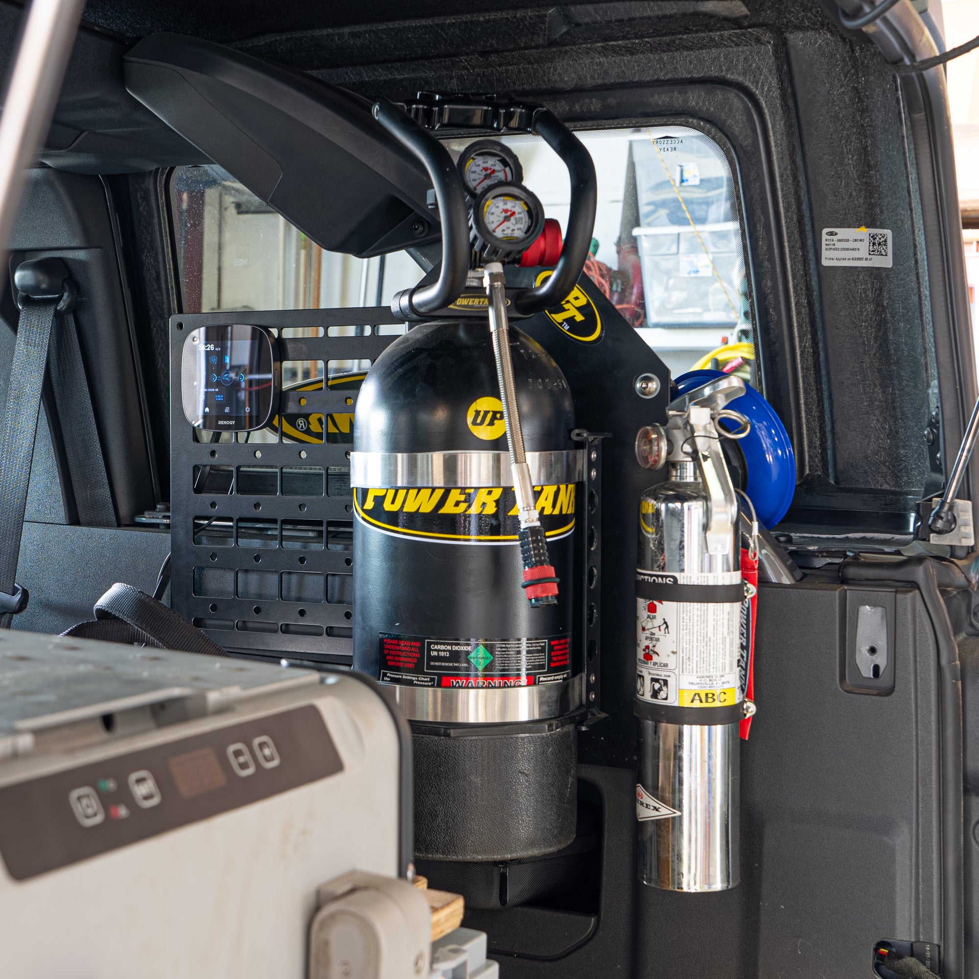 The 2dr Bronco Plate fits behind the rear seats, maximizing the limited cargo room. MOLLE cutouts allow the addition of a small bag (sold separately) or an optional Billet Quick-Release Bracket. Bolt-in install. Driver side only.