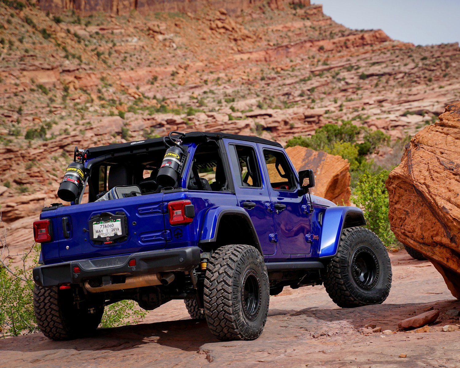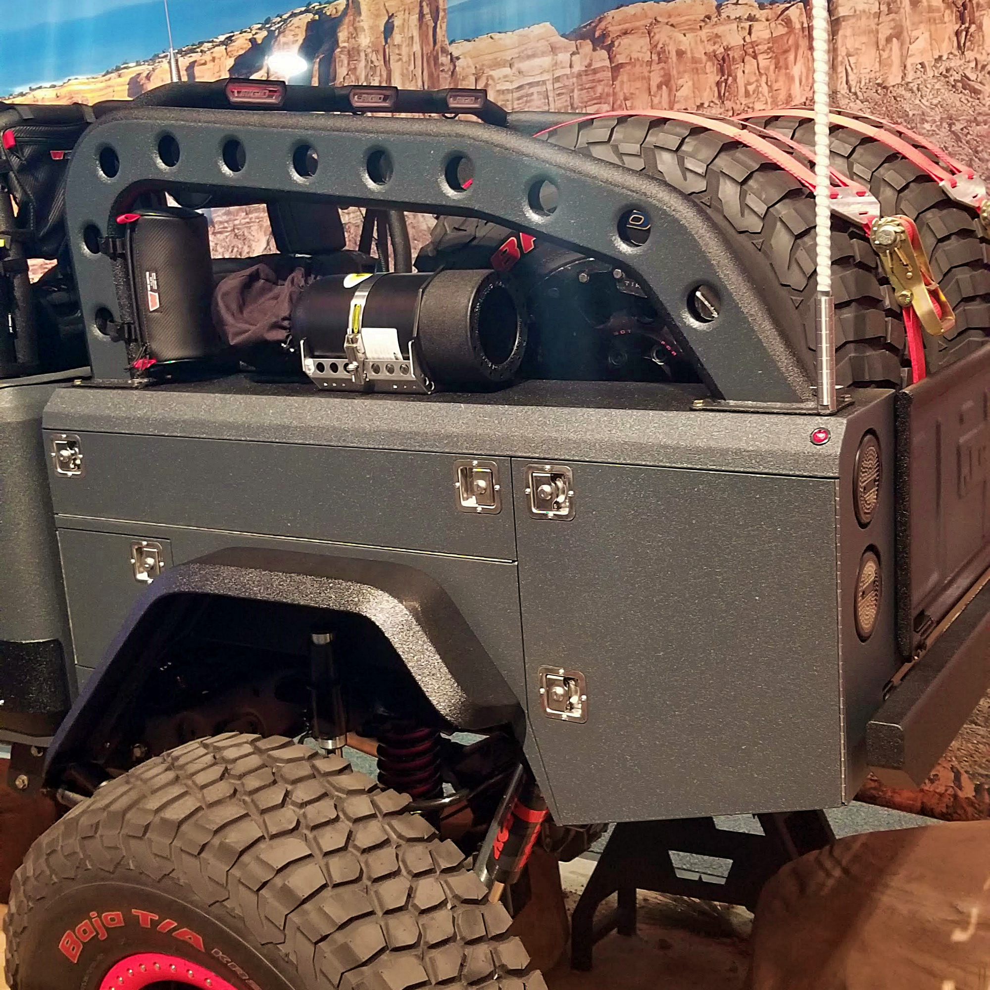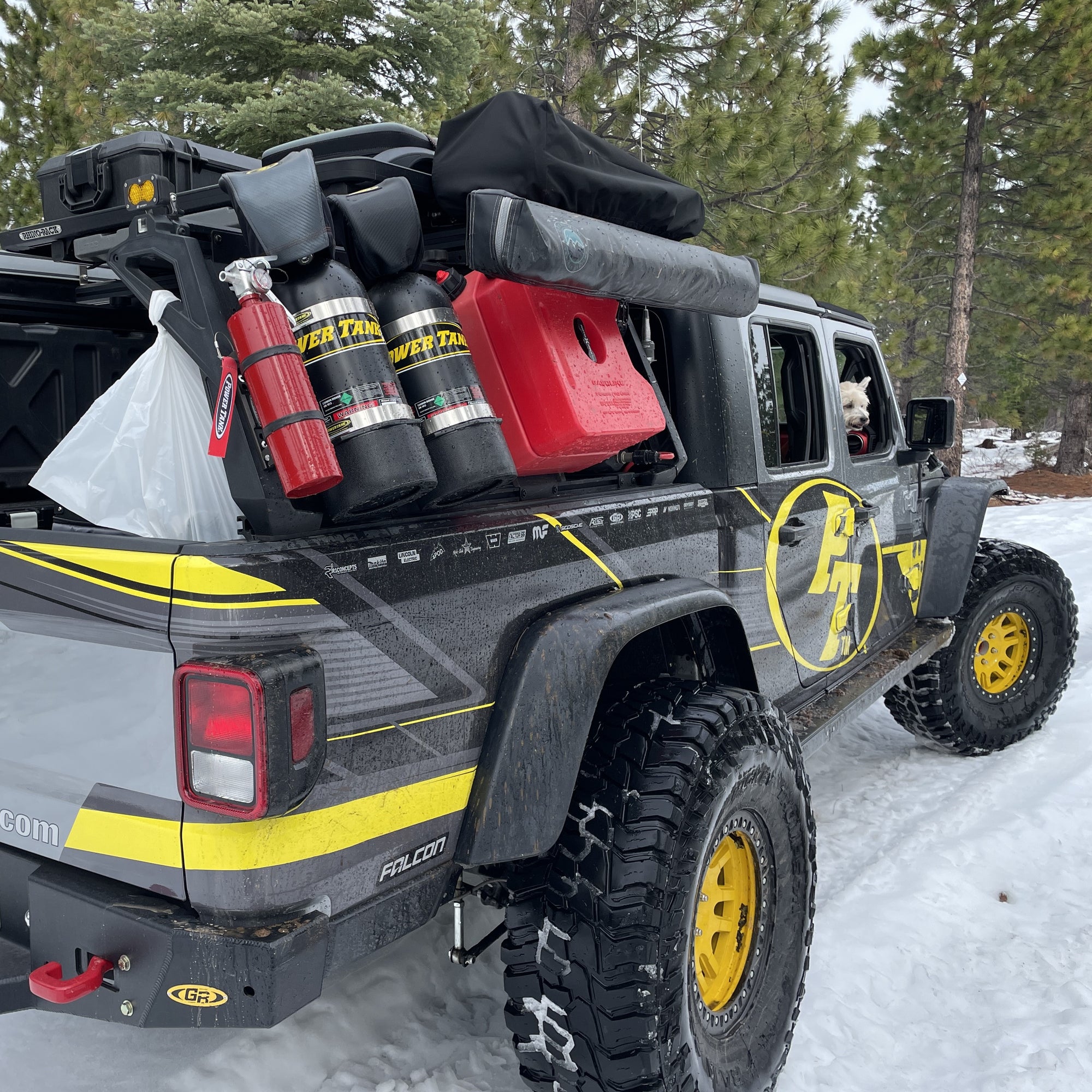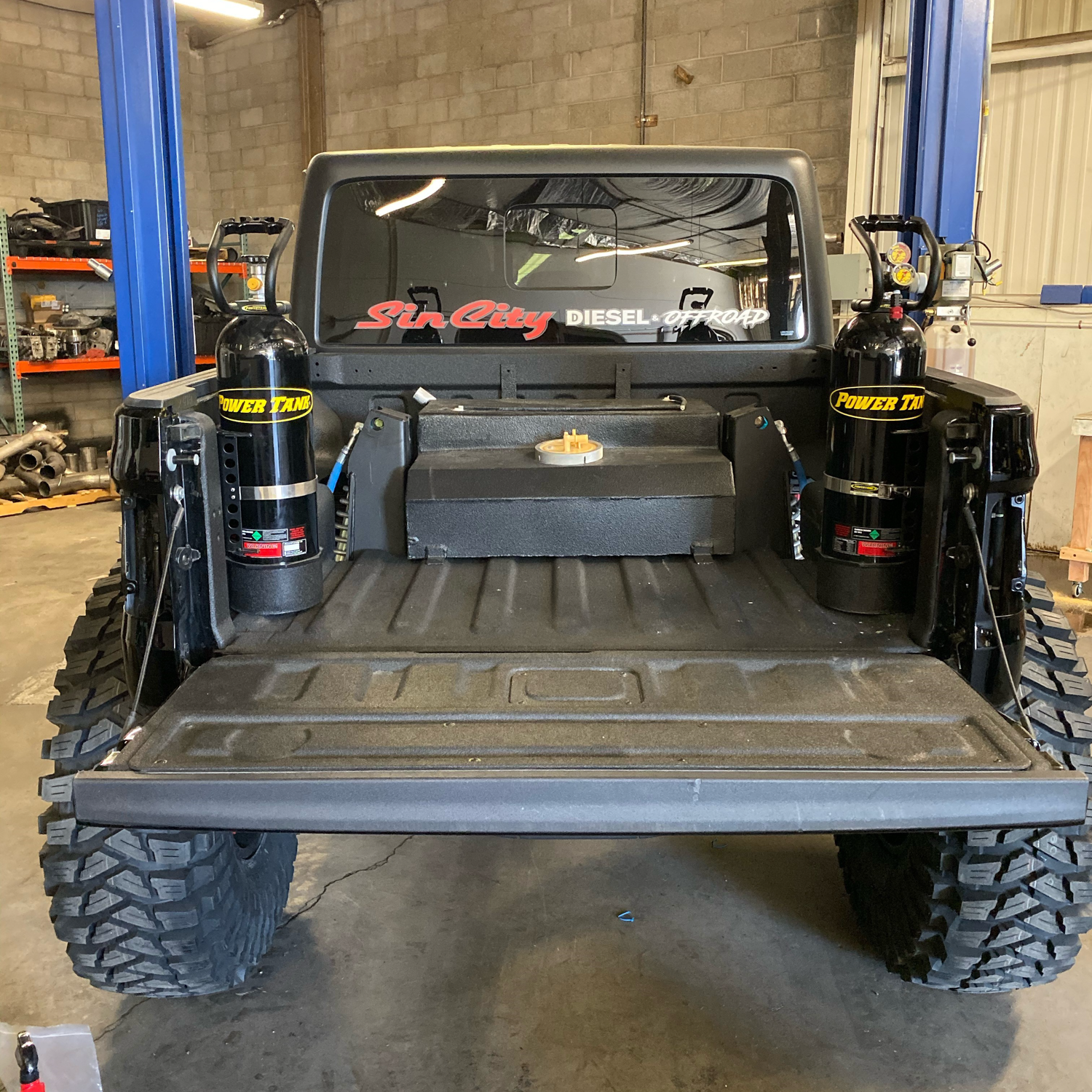 Before the Gladiator debuted, Bruiser Conversions cut the back off a Wrangler and made their own custom bed turning it into a custom chase truck. With, of course, twin Power Tanks on either side.