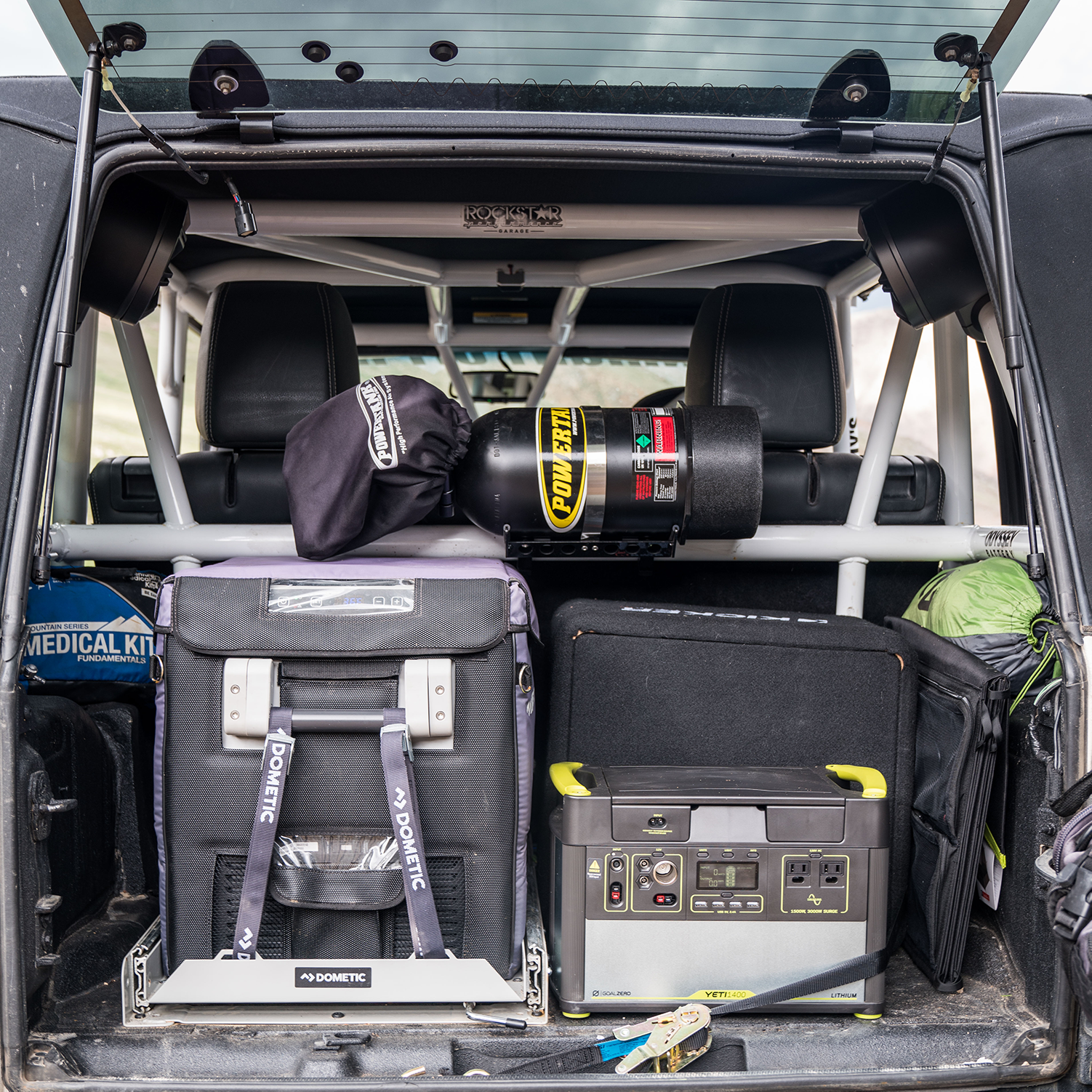 This Power Tank is mounted on the angled Floor Bracket on the shelf of this TJ. All the gear is close at hand and ready at a moment's notice.