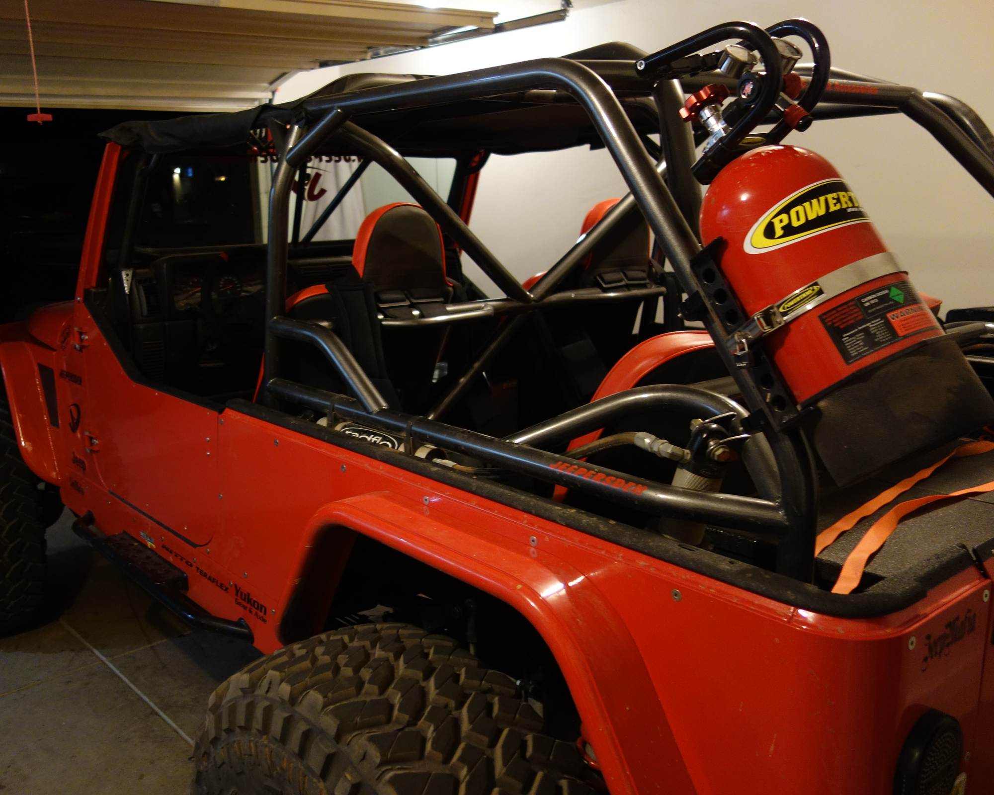The 10 lb Power Tank can fit around the stock TJ Roll Cage with padding using the Large Roll Bar Clamps. It fits well under the hard top.
