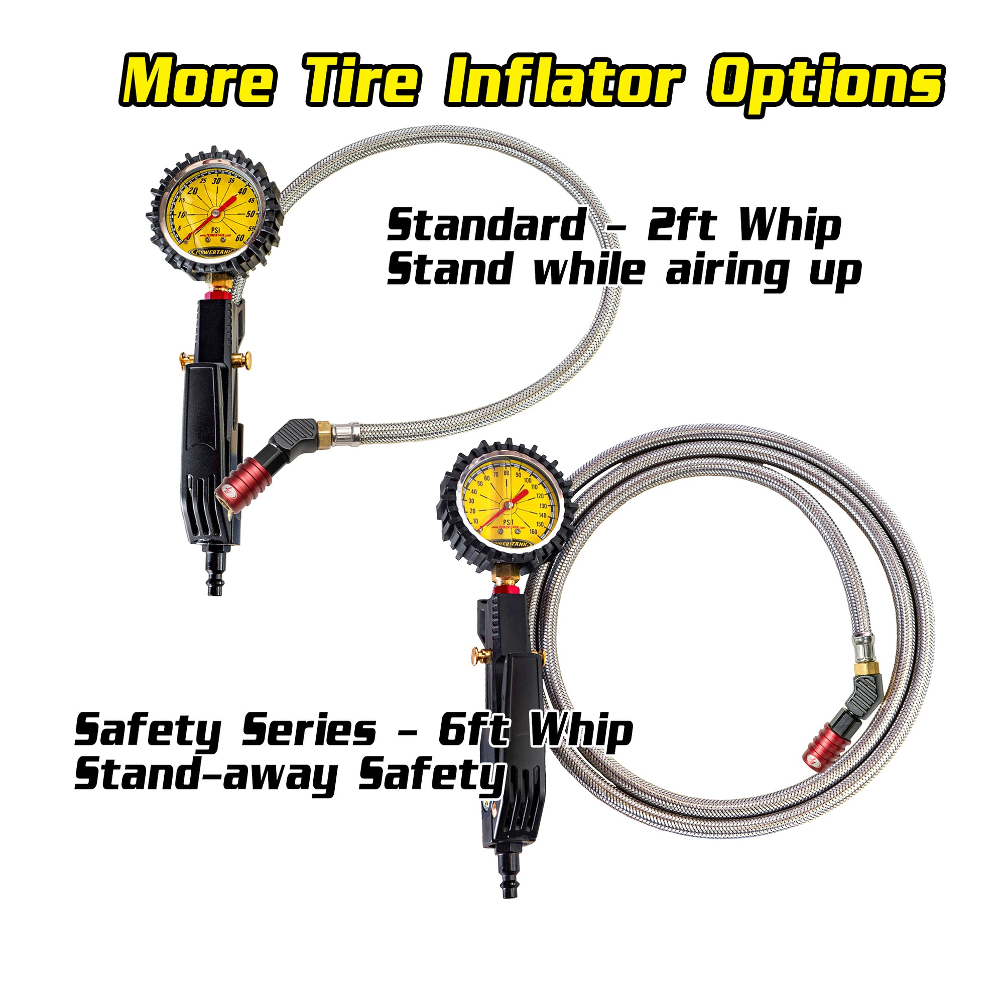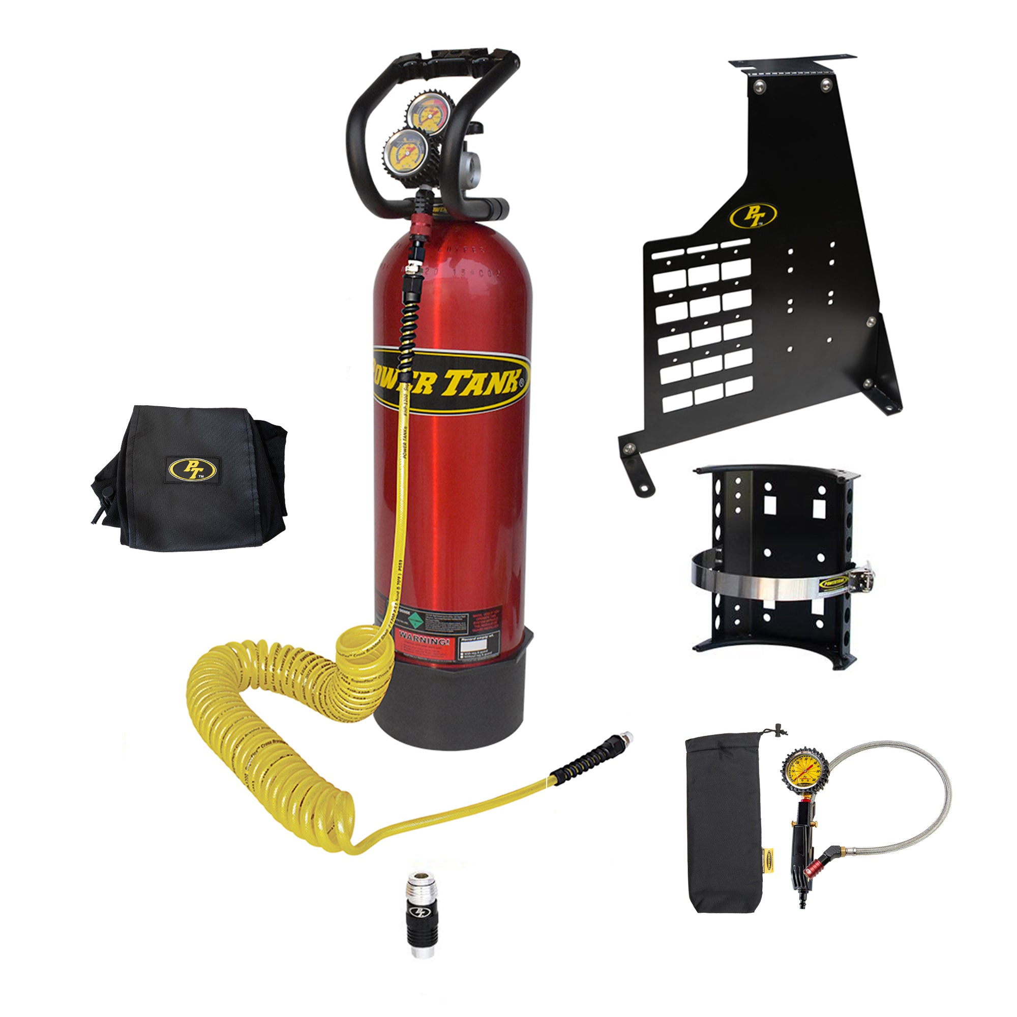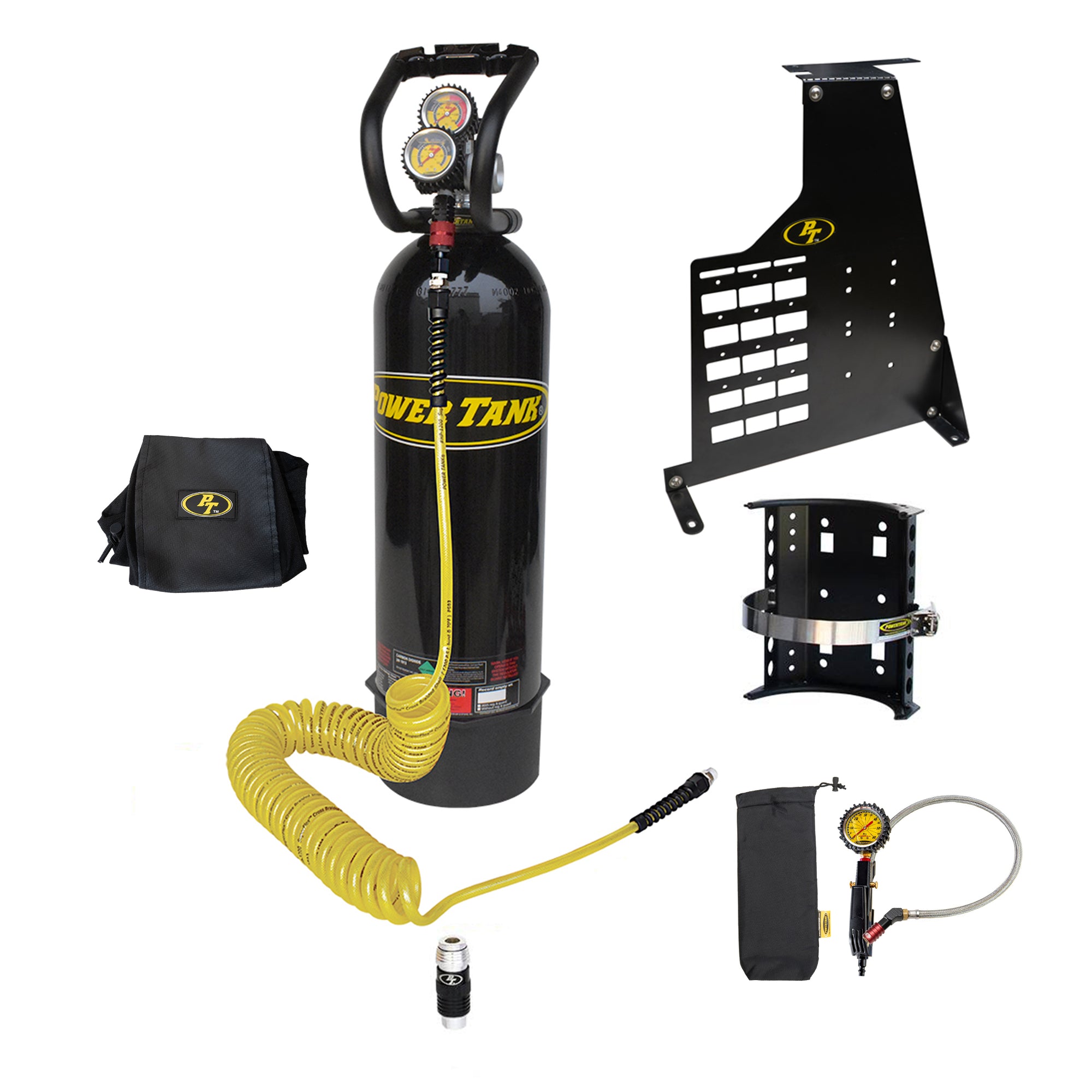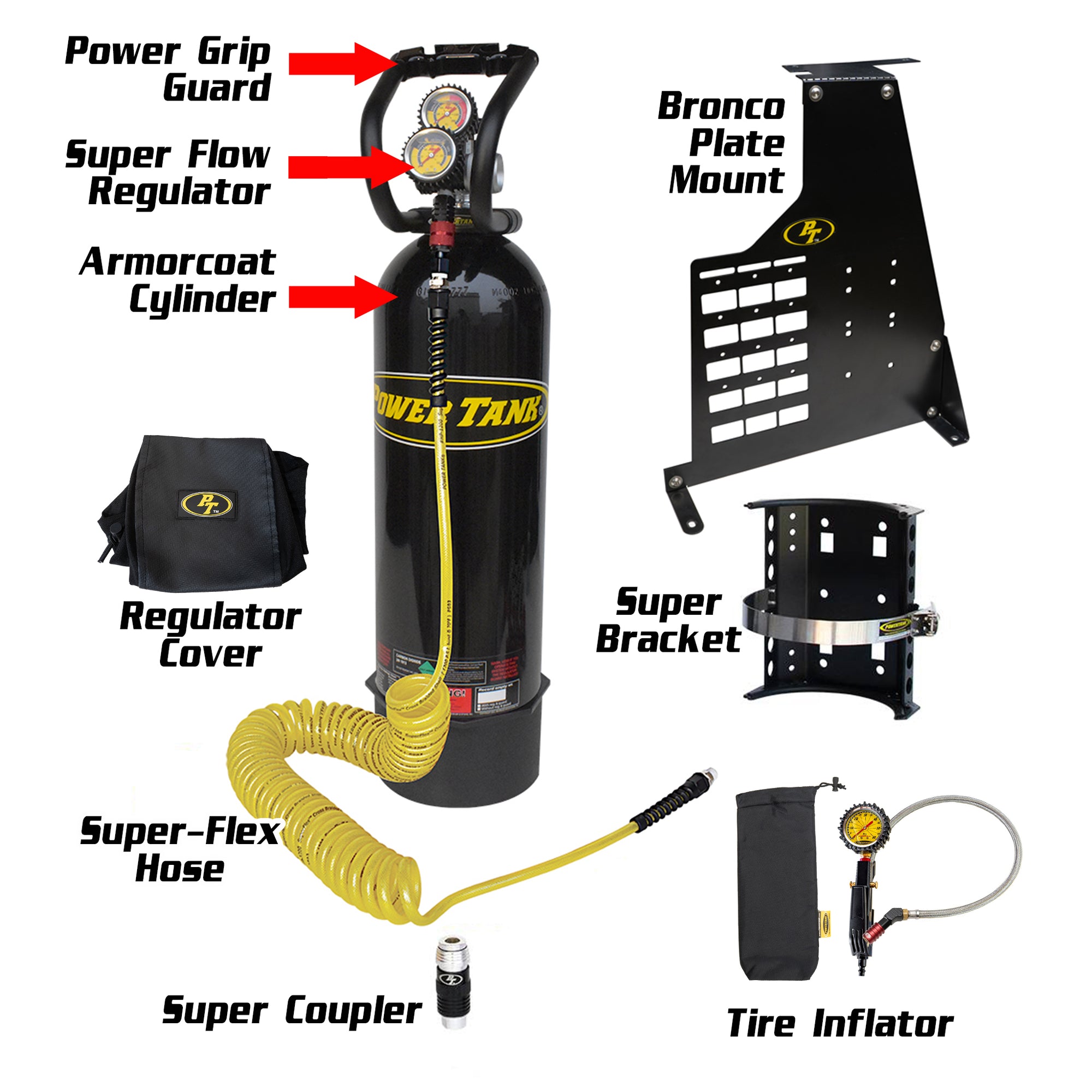 This 2 Door Bronco Edition Power Tank includes everything you need to run air tools with our advanced universal safety Super Coupler and air up tires through a dedicated HD Tire Inflator with Gauge. It also includes a Bronco Plate mount mated to a Super Bracket for an easy mounting solution, placing your Power Tank low, on the floor, for easy access.