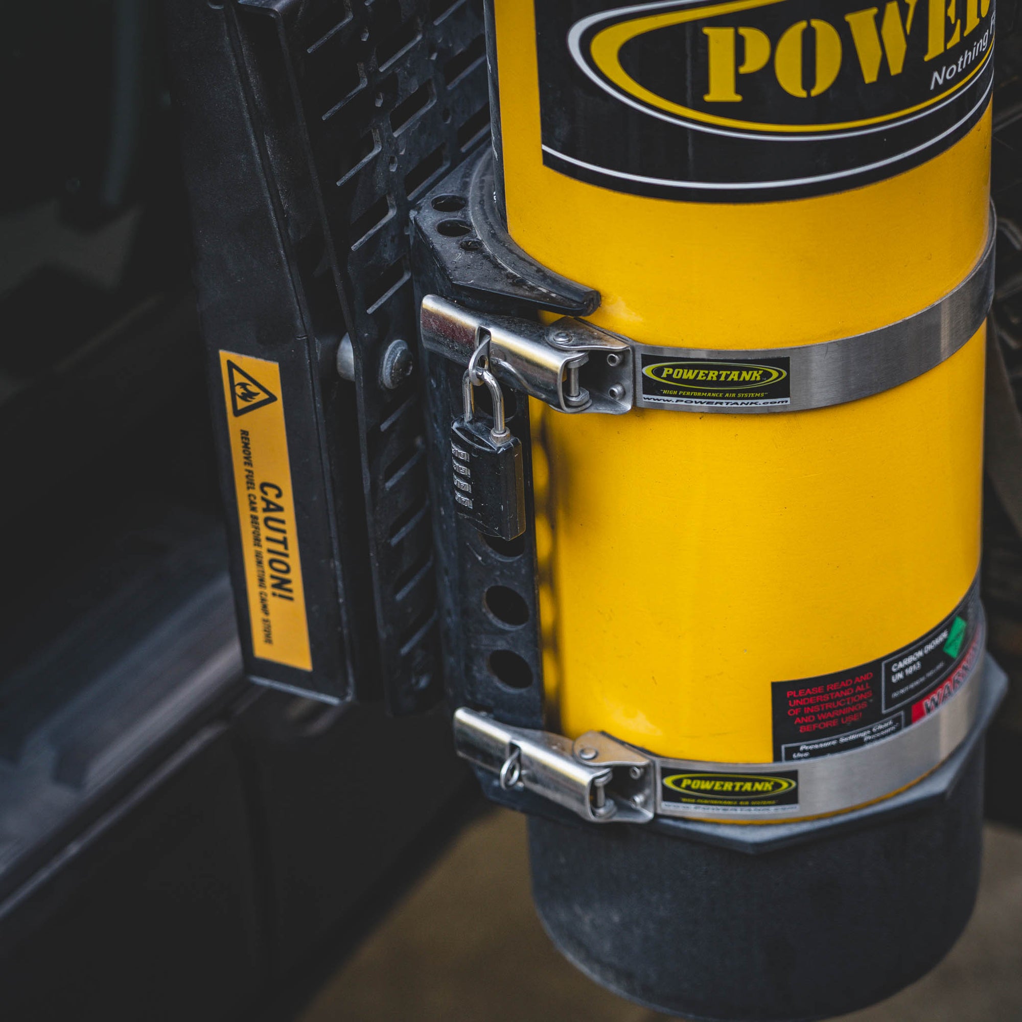 Not only does the Bronco Plate give you a robust mount for your Power Tank but it can also accommodate our Quick-Release Fire Extinguisher Mount (optional) and it has MOLLE/PALS slots to add extra storage bags (sold separately).