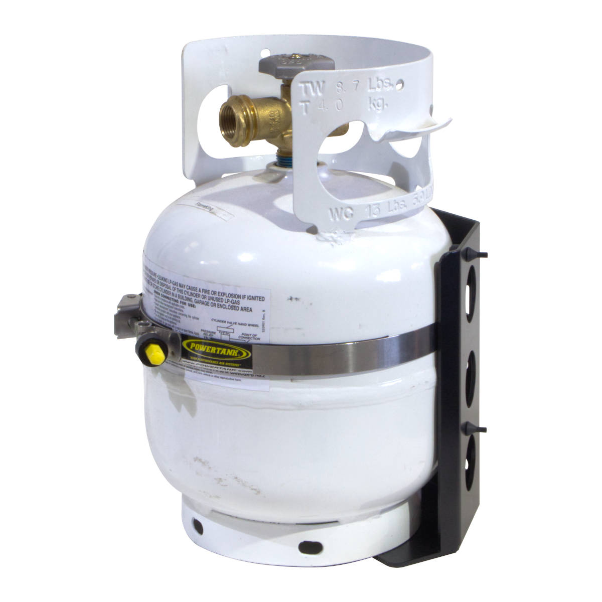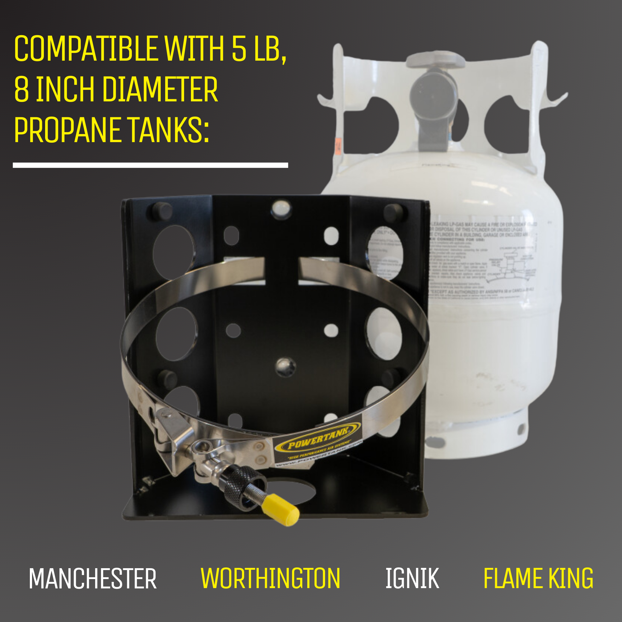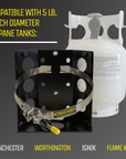 Propane Tank Bracket 5 lb LP Bottle 8 in. Diameter from Power Tank. For short camping trips the 5 lb. Propane (LP) tank is a great size propane tank holder. The tank that it fits is a Manchester 5 lb. propane tank, Model 10054.3, 8 in. diameter.