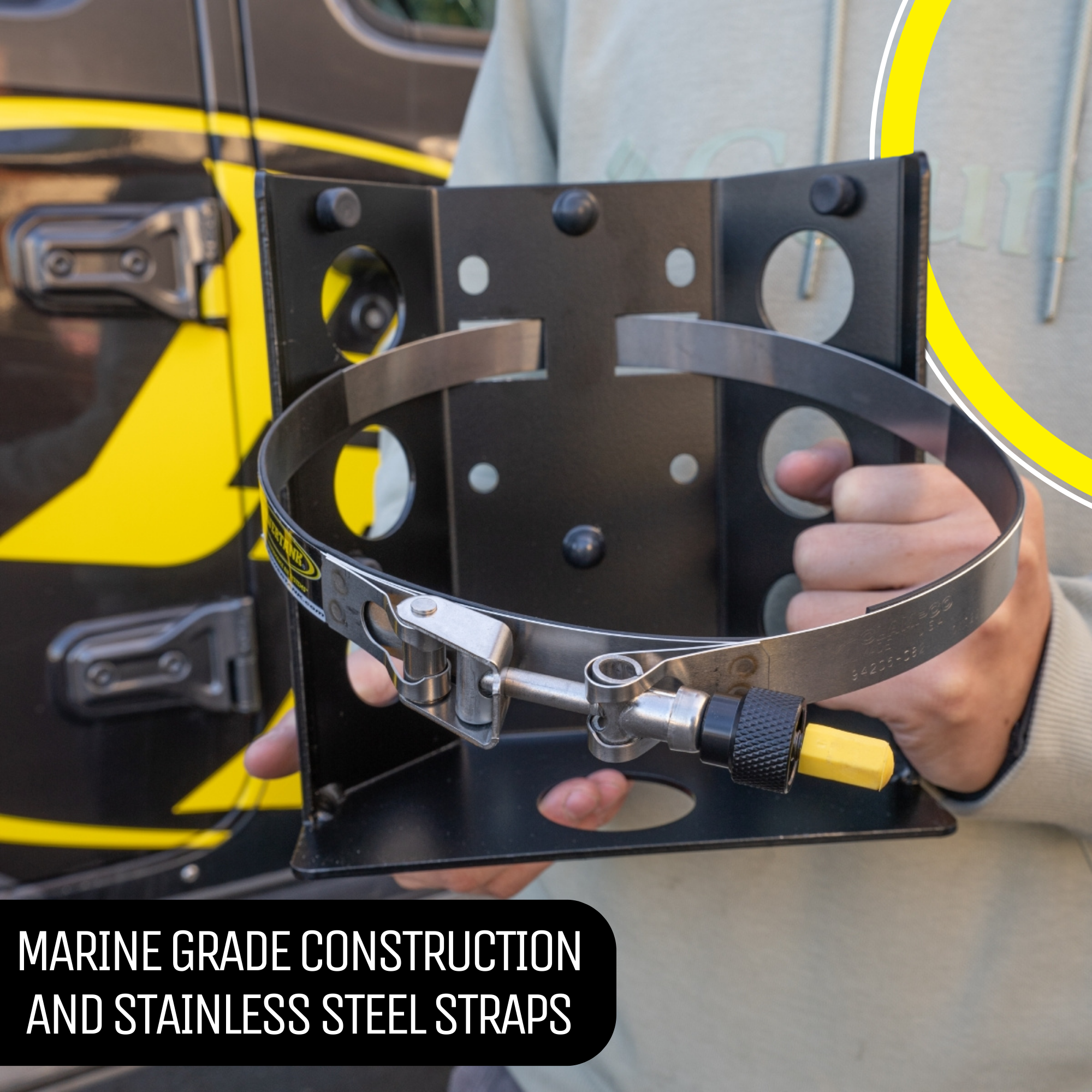 • COMPATIBLE WITH VEHICLE MOUNTS: This propane tank bracket is compatible with various Power Tank vehicle mounts including Roll Bar Clamps, Ladder Mounts, MOLLE Power Plate, Wrangler, Jeep, and Toyota, offering versatile mounting options for your convenience.