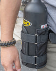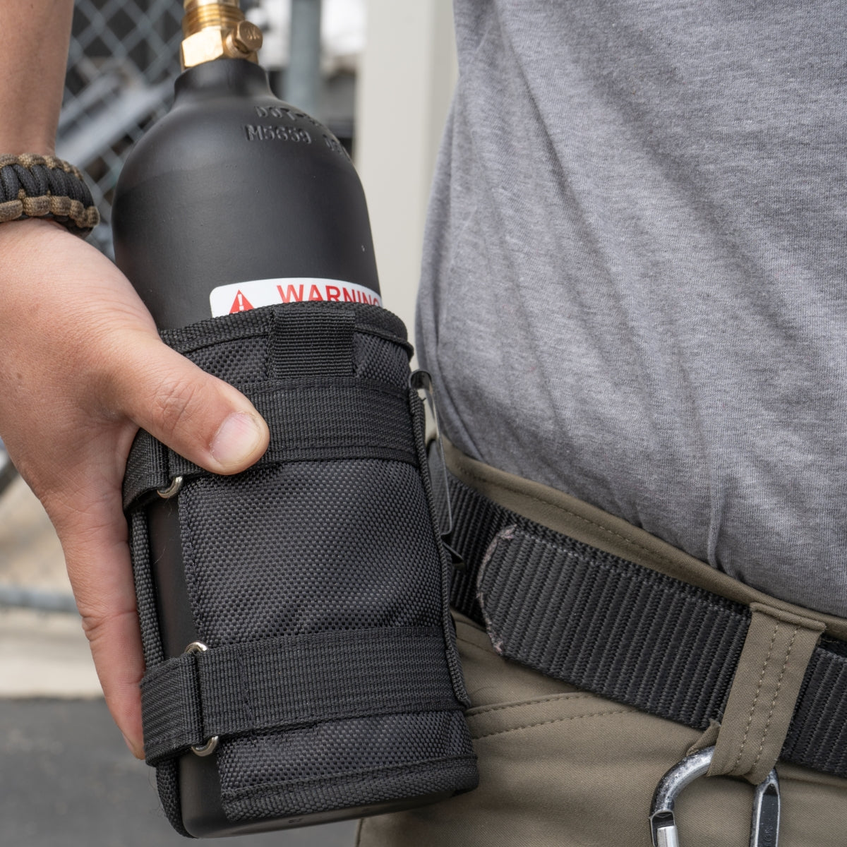 Nylon webbing and metal D-rings cinch the sleeve around the bottles tightly. Use this item as your main bottle carrying system or use it to hold spare bottles when climbing ladders.