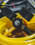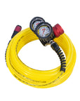 The two gauges give you the tank pressure and the outlet pressure. At the end of the hose is a high pressure industrial-style coupler.