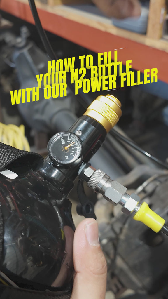 Nitrogen N2 Bottle Power Filler from Power Tank. Our N2 Power Filler is used to refill our mini N2 bottles in the NIT-0400 Shock Filler Kit and the LTC-0200 Lovell T-Case air kit. All you need is a full N2 mother tank to fill from which you can get at your local welding gas supplier.